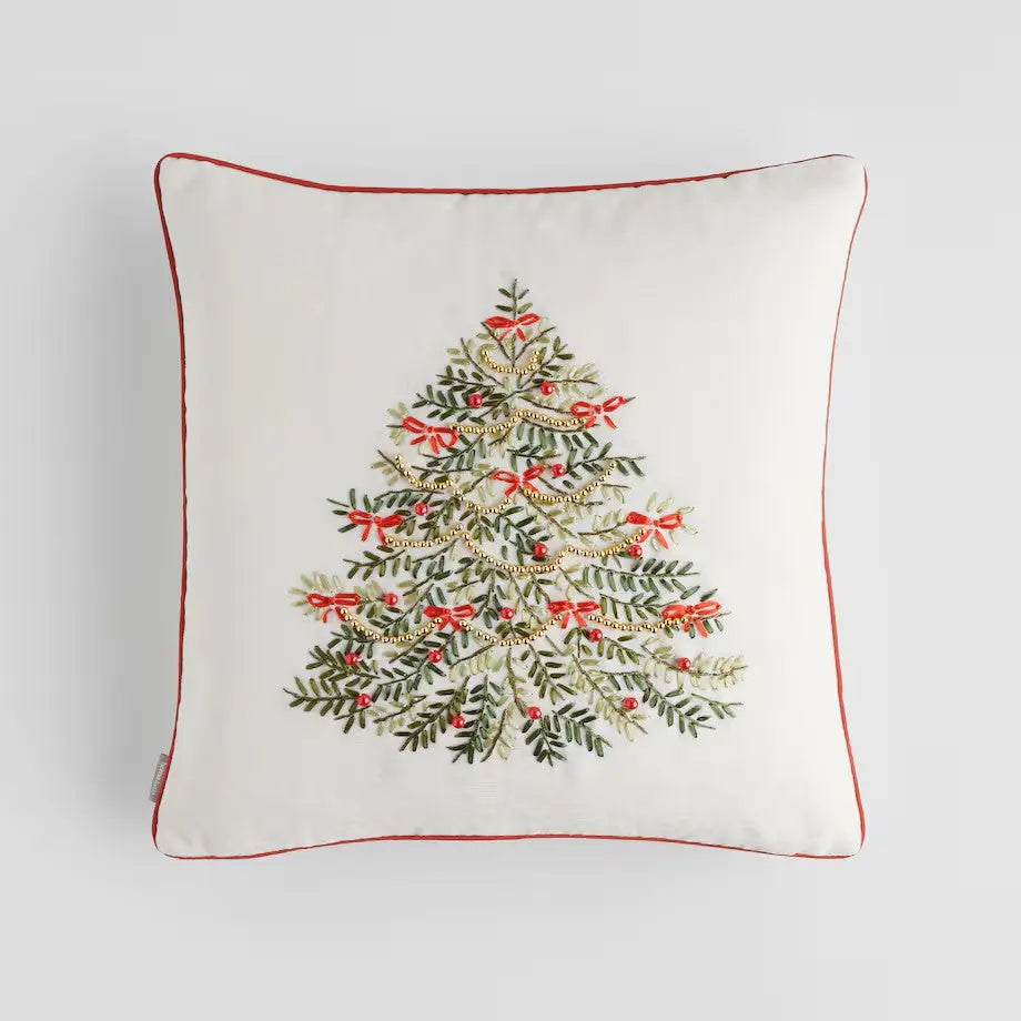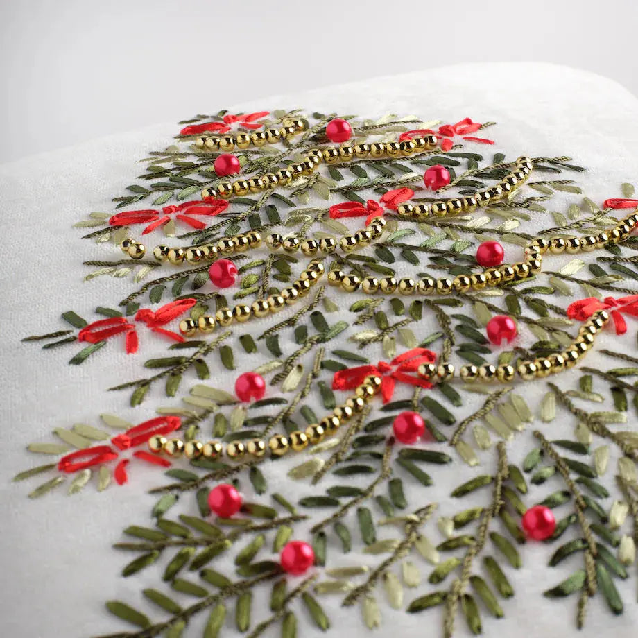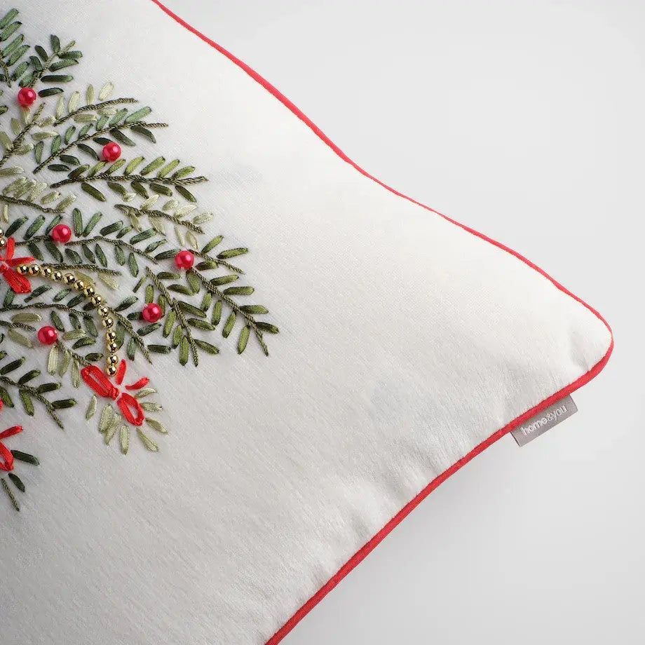 Biele pozadie obliečky na vankúš zvýrazňuje bohato vyšívaný kvetinový motív: zelené konáre, červené perly, zlaté korálky a výrazné červené mašle integrované do vianočného stromčeka. Červené lemovanie pozdĺž okrajov dodáva eleganciu a slávnostný nádych . Minimalistický, no zároveň výrazný dizajn dokonale dopĺňa vianočnú výzdobu obývačky, spálne alebo detskej izby. Je tiež decentným a štýlovým darčekom .