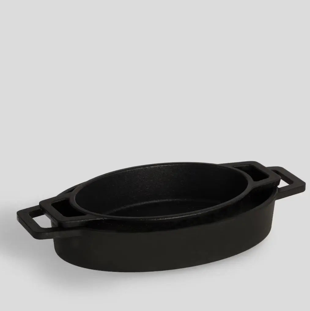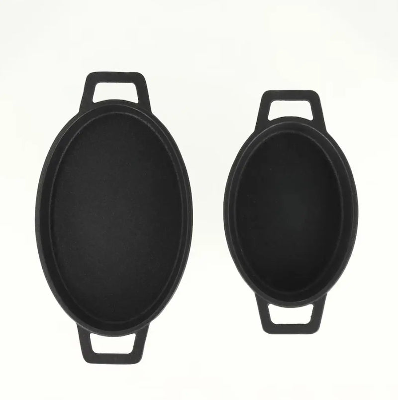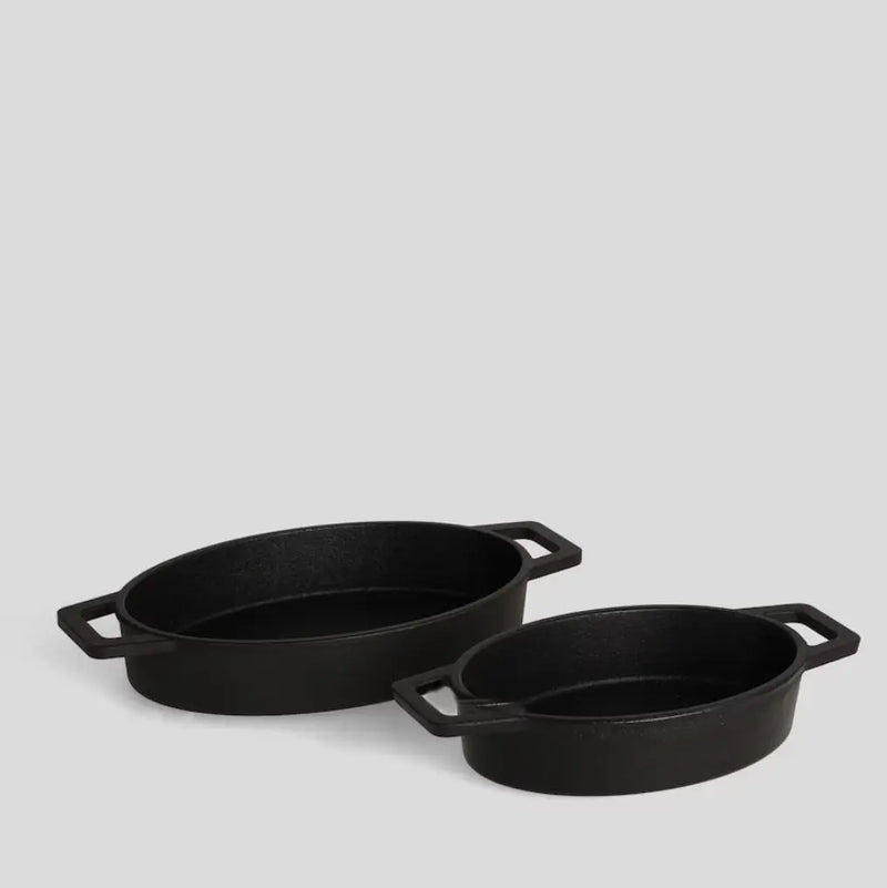 Čierna sada dvoch zapekacích mís. Liatinový riad v klasickej čiernej farbe. Jeho pevná liatinová konštrukcia zaisťuje rovnomerné varenie a dlhodobé používanie. Perfektné na prípravu a servírovanie jedál, kombinuje funkčnosť s elegantným, moderným dizajnom a dodáva každému jedlu jedinečný charakter.