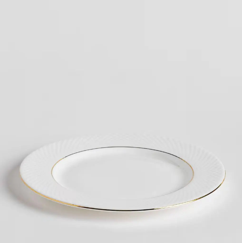 Biely porcelánový tanier. Je rafinovaným prvkom stolového riadu, ktorý dodá eleganciu. Vyrobený z najkvalitnejšieho kostného porcelánu, poteší svojou jemnou textúrou a lesklým povrchom. Jeho klasická biela farba mu dodáva univerzálny charakter, ktorý sa perfektne hodí k rôznym štýlom aranžovania. Zlatý okraj dodáva jedinečný lesk a eleganciu, čím zvýrazňuje jeho rafinovaný charakter.
