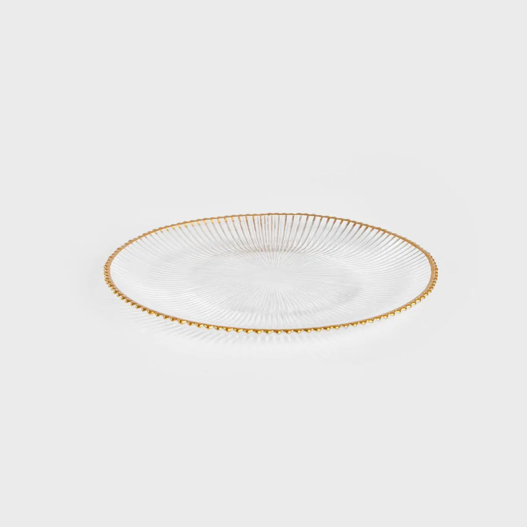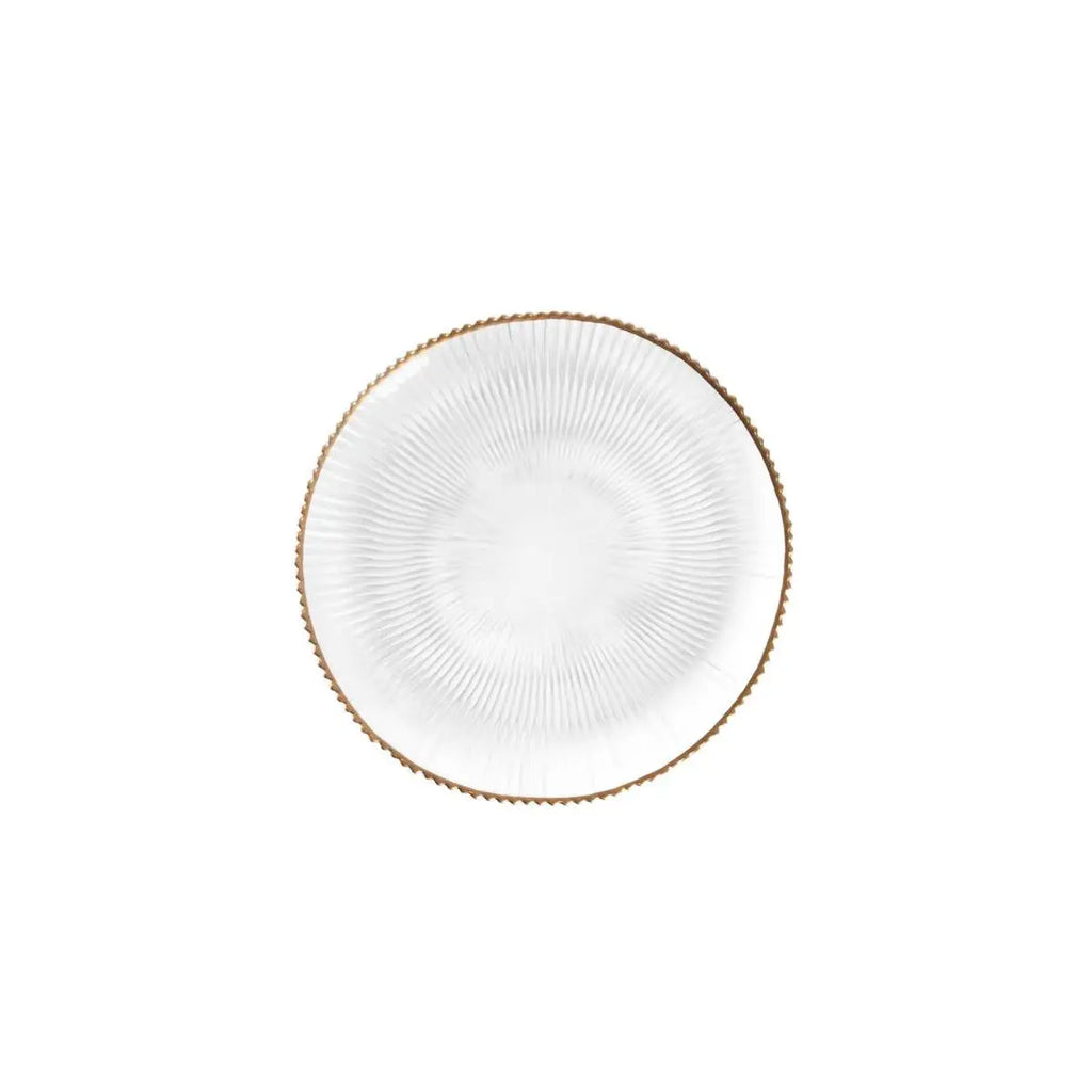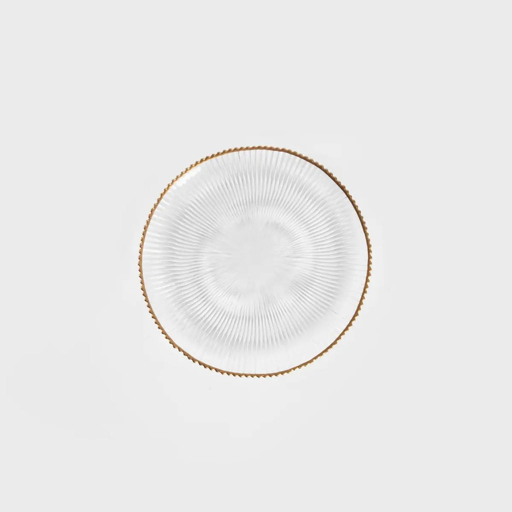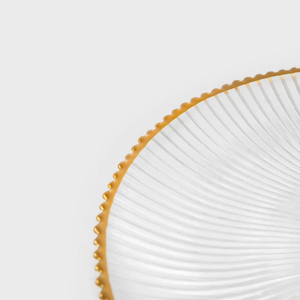 Dodajte svojmu stolu nádych elegancie s dezertným tanierom LYNN. Jeho jemný, priehľadný dizajn v kombinácii so zlatým okrajom sa perfektne hodí na každú príležitosť a vytvorí harmonický celok na stole. Jeho priemer 21 cm z neho robí ideálnu voľbu na servírovanie dezertov, občerstvenia alebo ovocia a jemné drážky mu dodávajú elegantný charakter.
