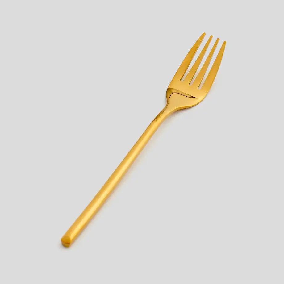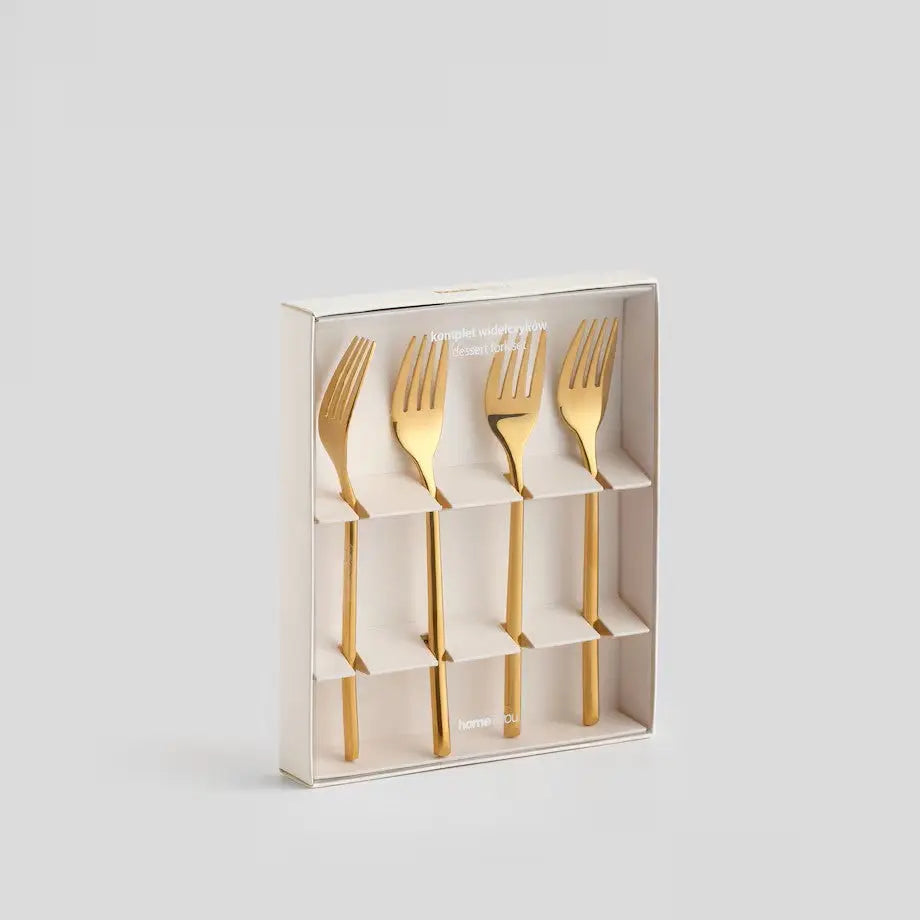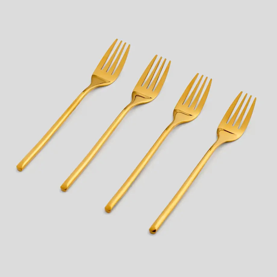 Elegantná sada štyroch vidličiek zlatej farby, vyrobených z vysoko kvalitnej nehrdzavejúcej ocele. Každá vidlička je dlhá 15 cm, čo ich robí ideálnymi na dezerty, občerstvenie a ovocie, a štýlový dizajn dodáva každému miestu sofistikovaný nádych.