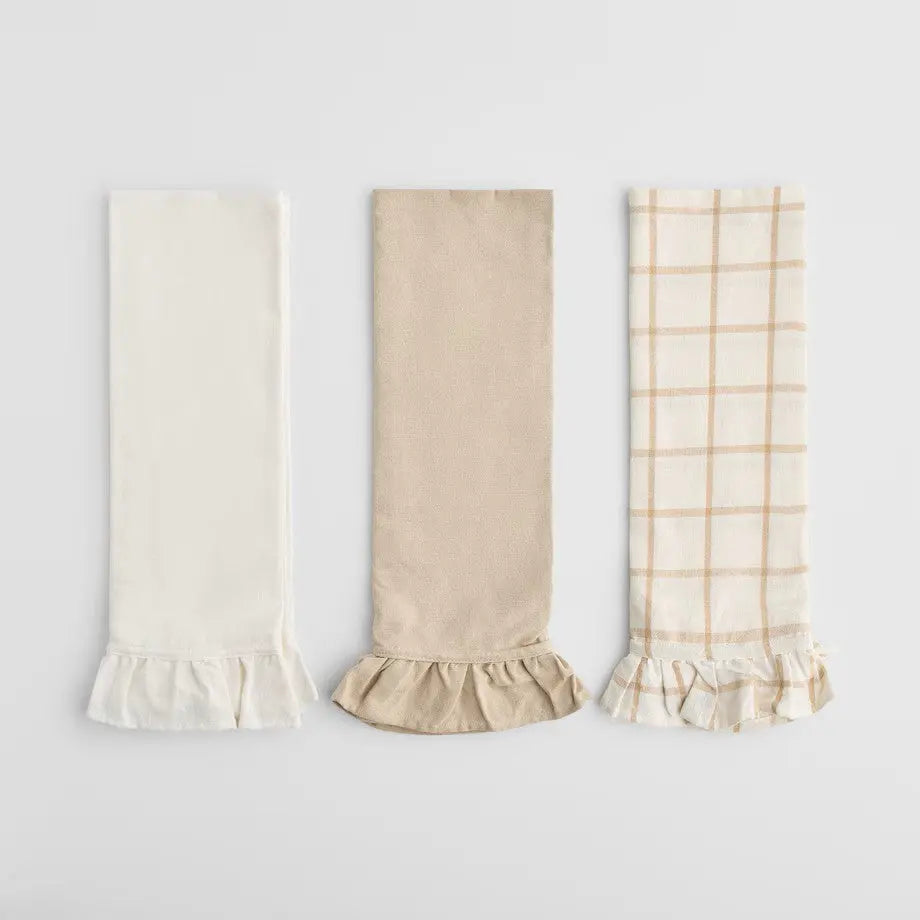 Sada pozostáva z troch utierok v jemných béžových a krémových odtieňoch: jednofarebnej krémovej a béžovej a jednej v klasickom kockovanom vzore. Dekoratívny volán prišitý na spodok každej látky im dodáva romantický charakter, ktorý dokonale zapadá do rustikálnych, provensálskych aj moderných interiérov. Celé zariadenie bude dokonalé nielen vo vašej kuchyni, ale aj ako štýlový darček pre milovanú osobu, ktorá oceňuje kombináciu estetiky a funkčnosti.