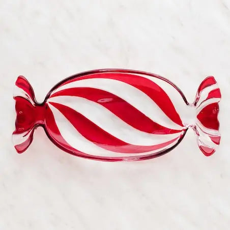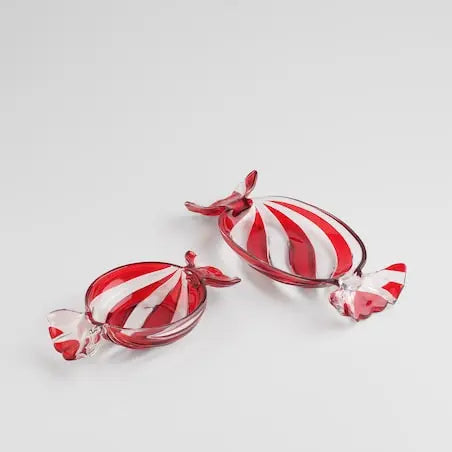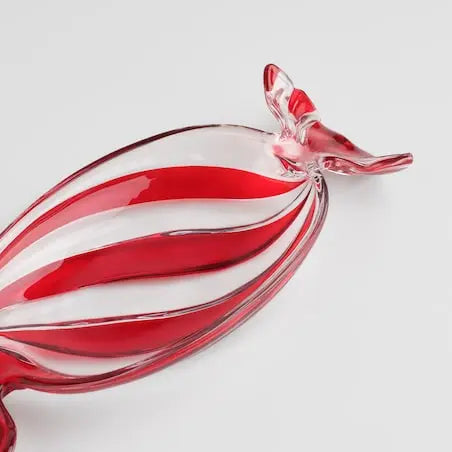 Táto jedinečná dekoratívna miska je vyrobená z lesklého sodnovápenatého skla. Dizajn je inšpirovaný baleným cukríkom, s detailne tvarovanými zriasenými koncami, ktoré imitujú papierový obal. Má nápadný červený a biely pruhovaný vzor (vitráž), ktorý okamžite dodáva priestoru slávnostnú a hravú atmosféru.