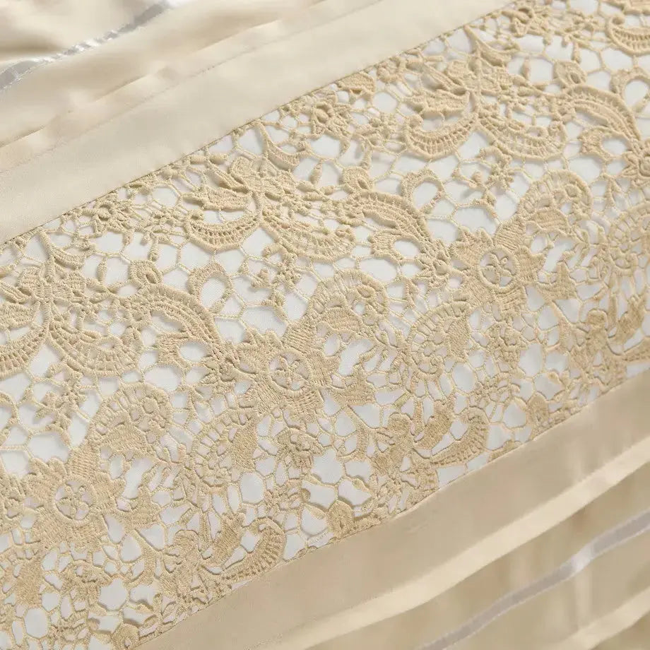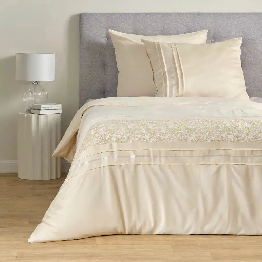 Svetlokrémová farba posteľnej bielizne s dekoratívnym vyšívacím pásikom a jemnými pruhmi na vankúšoch zapadá do glamour štýlu a moderného minimalizmu. Jemný kvetinový motív a prepracovaná čipka dodávajú setu sofistikovaný vzhľad, ktorý zdôrazní elegantný charakter vašej spálne. Univerzálna farebná schéma dokonale ladí so svetlejšími aj tmavšími aranžmánmi. Jasme posteľná bielizeň môže byť tiež ideálnym darčekom na výnimočnú príležitosť.