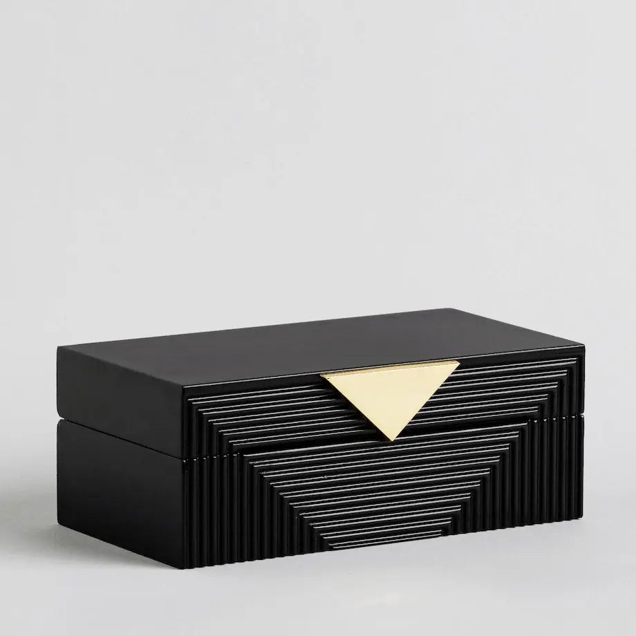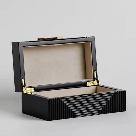 Táto čierna šperkovnica vyžaruje eleganciu a sofistikovanosť. Jej sýta čierna farba v kombinácii so zlatými akcentmi vytvára luxusný vzhľad, ktorý ľahko doplní každý toaletný stolík. Priestranný interiér šperkovnice poskytuje dostatok úložného priestoru na rôzne šperky – od náhrdelníkov až po náramky. Vďaka robustnej konštrukcii a vysoko kvalitným materiálom táto šperkovnica nielen chráni vaše cennosti, ale dodáva aj nádych noblesy každému interiéru. Je to ideálne miesto na bezpečné a štýlové uloženie vašich šperkov. Pozrite si aj naše ďalšie šperkovnice.Táto čierna šperkovnica vyžaruje eleganciu a sofistikovanosť. Jej sýta čierna farba v kombinácii so zlatými akcentmi vytvára luxusný vzhľad, ktorý ľahko doplní každý toaletný stolík. Priestranný interiér šperkovnice poskytuje dostatok úložného priestoru na rôzne šperky – od náhrdelníkov až po náramky. Vďaka robustnej konštrukcii a vysoko kvalitným materiálom táto šperkovnica nielen chráni vaše cennosti, ale dodáva aj nádych noblesy každému interiéru. Je to ideálne miesto na bezpečné a štýlové uloženie vašich šperkov. Pozrite si aj naše ďalšie šperkovnice.
