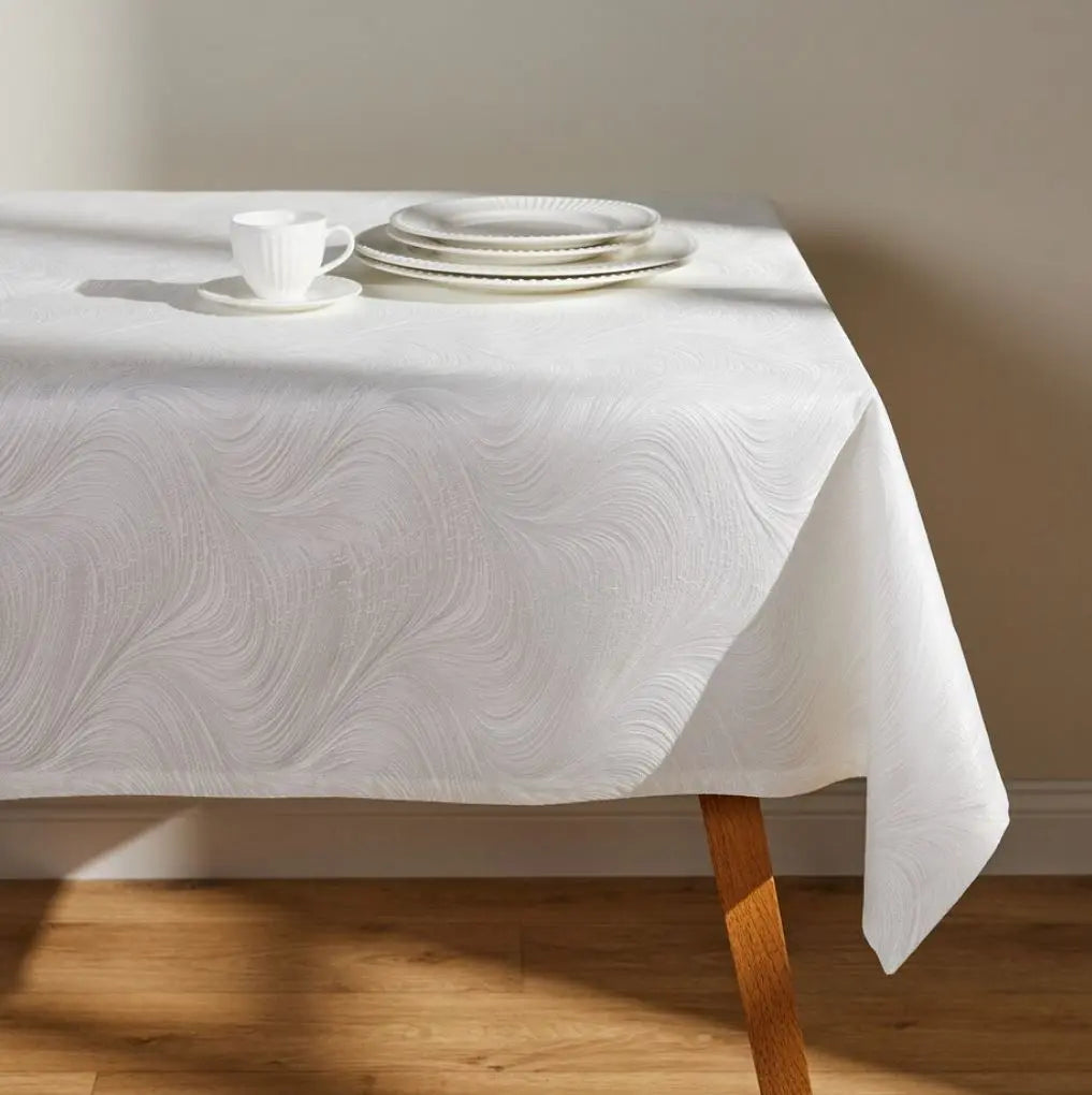 Biely polyesterový obrus v pridanou viskózou. Je nielen pekný dekoratívny doplnok vášho stola, ale taktiež ochráni vrchnú dosku pred poškodením a fľakmi. Skvelo ozdobí váš jedálenský stôl alebo doplní váš interiér.