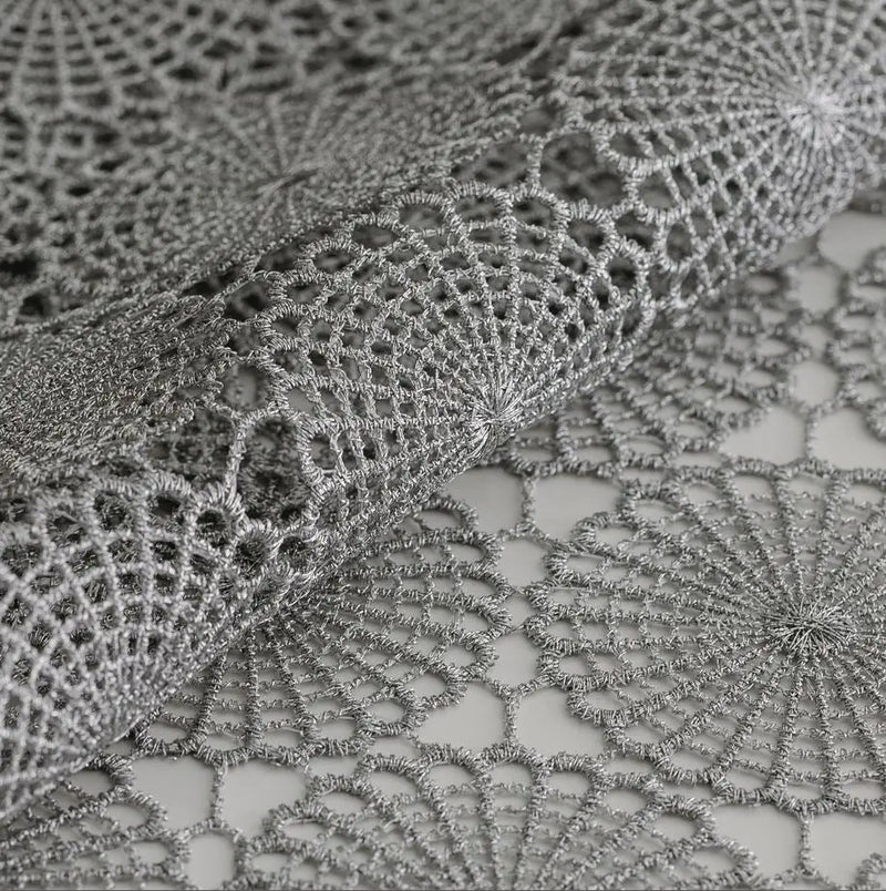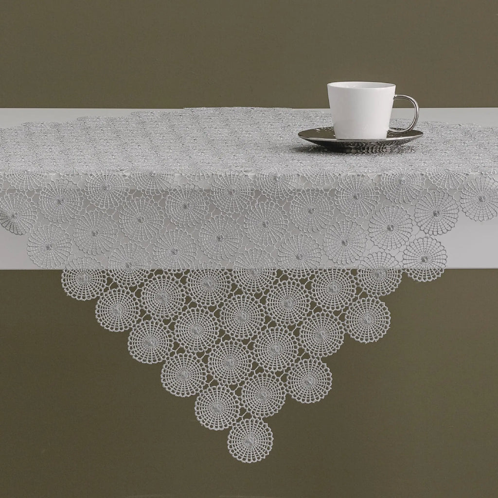 Strieborný obrus z polyesteru a metizovaného vlákna. Je nielen pekný dekoratívny doplnok vášho stola, ale taktiež ochráni vrchnú dosku pred poškodením a fľakmi. Skvelo ozdobí váš jedálenský stôl alebo doplní váš interiér.