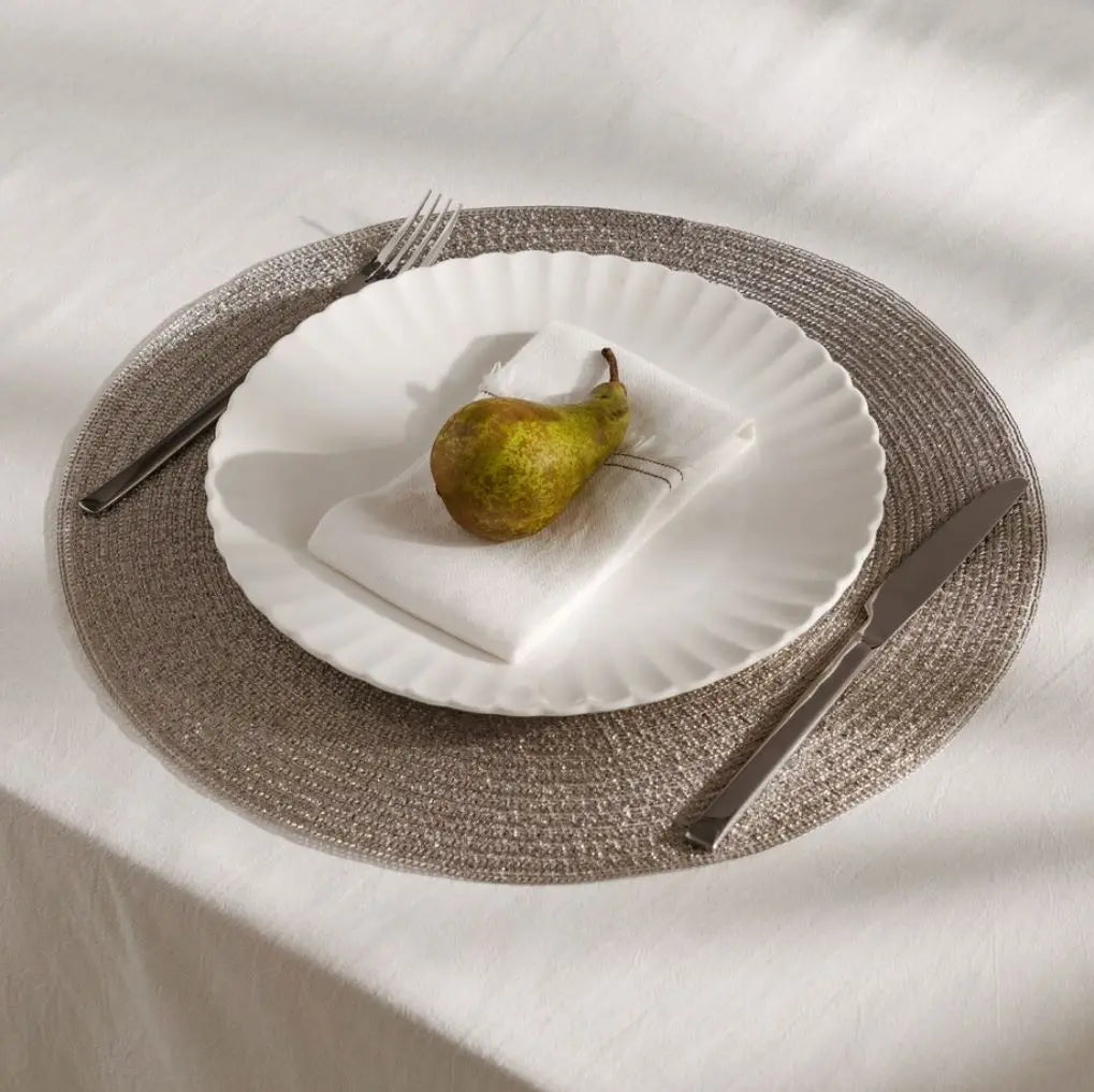 Strieborné polyesterové prestieranie. Má neskutočne pôvabnú striebornú farbu a pravidelný vzor. Takéto atraktívne prestieranie určite veľmi obohatí dizajn interiéru jedálne.