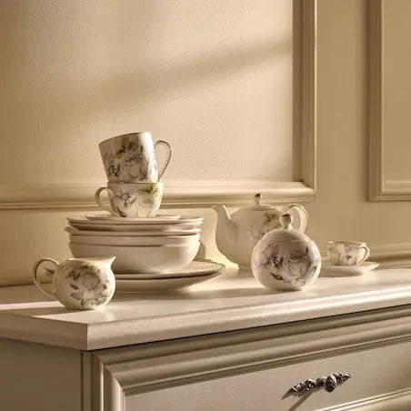 Šálka s podšálkou Arrosa sú vyrobené z hladkého, lesklého krémového porcelánu. Prvky sú zdobené realistickým kvetinovým vzorom v pastelových odtieňoch zelenej, ružovej a jemnej fialovej, ktorý pripomína sezónnosť a sviežosť prírody. Každý okraj je zakončený jemným zlatým prúžkom, ktorý zdôrazňuje nenápadnú estetiku súpravy. Klasický tvar a pohodlné ucho robia z používania šálky každodenný rituál. Kvetinové motívy evokujú pohostinnosť a očarujúce stretnutia, takže Arrosa dokonale dopĺňa moderné aj tradičné aranžmány. Je to jedinečný detail, ktorý robí čas strávený vychutnávaním si čaju ešte hodnotnejším.