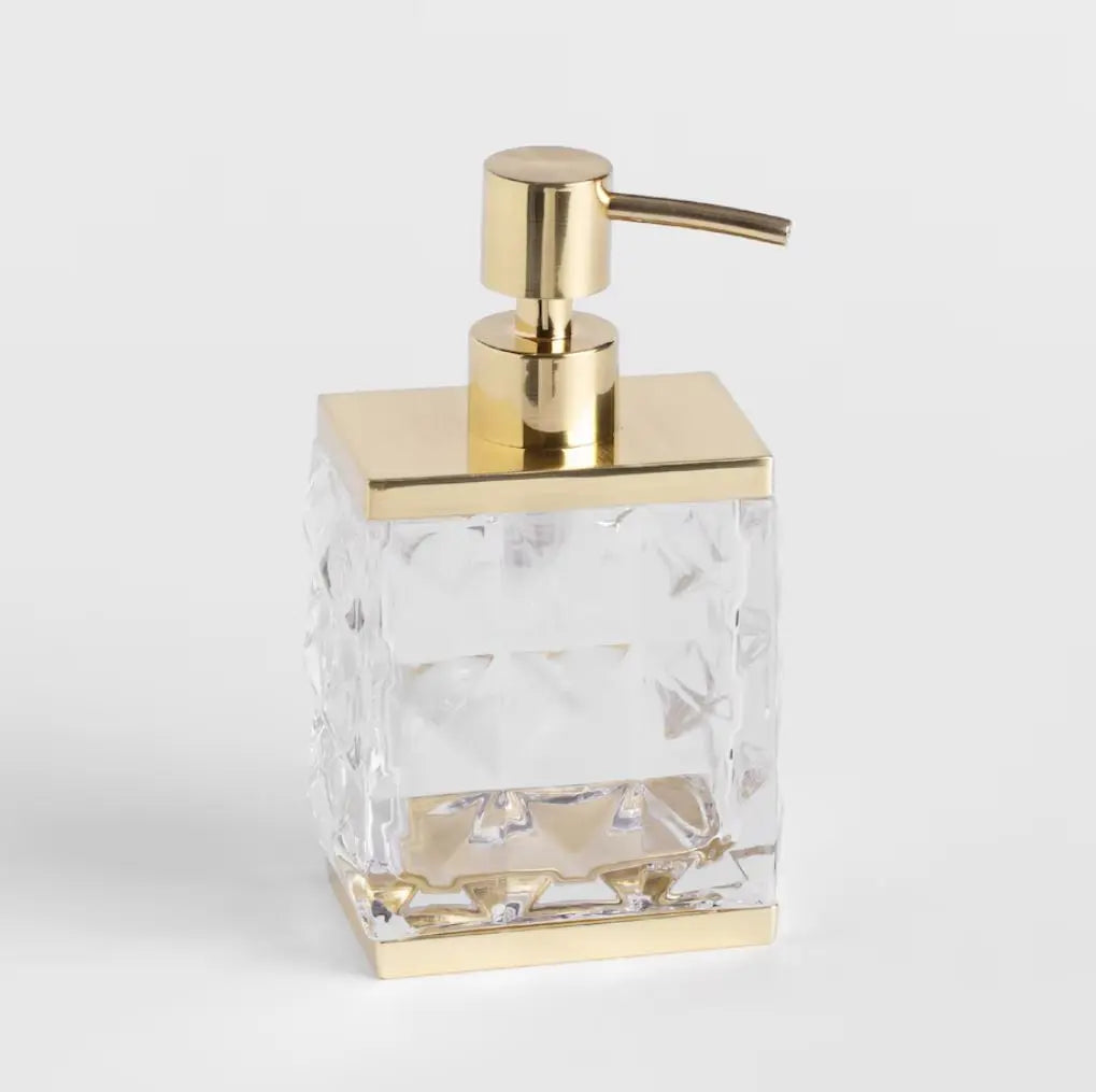 Zlatý dávkovač s transparentným skleneným priestorom na tekutinu. Jeho veľkou výhodou je možnosť použitia pre rôzne tekutiny podľa vášho výberu: tekuté mydlo, tekuté dezinfekčné prostriedky, pleťovú čistiacu vodu, pleťový čistiaci olej, umývacie prostriedky na riad. Štýlový doplnok ideálny do kúpeľne aj do kuchyne. Umožní šetriť čistiacu tekutinu a zároveň obmedzí šírenie baktérií. Jednoduché plnenie odskrutkovaním vrchnej časti dávkovača.