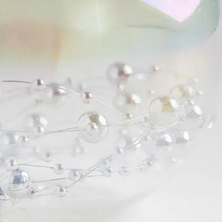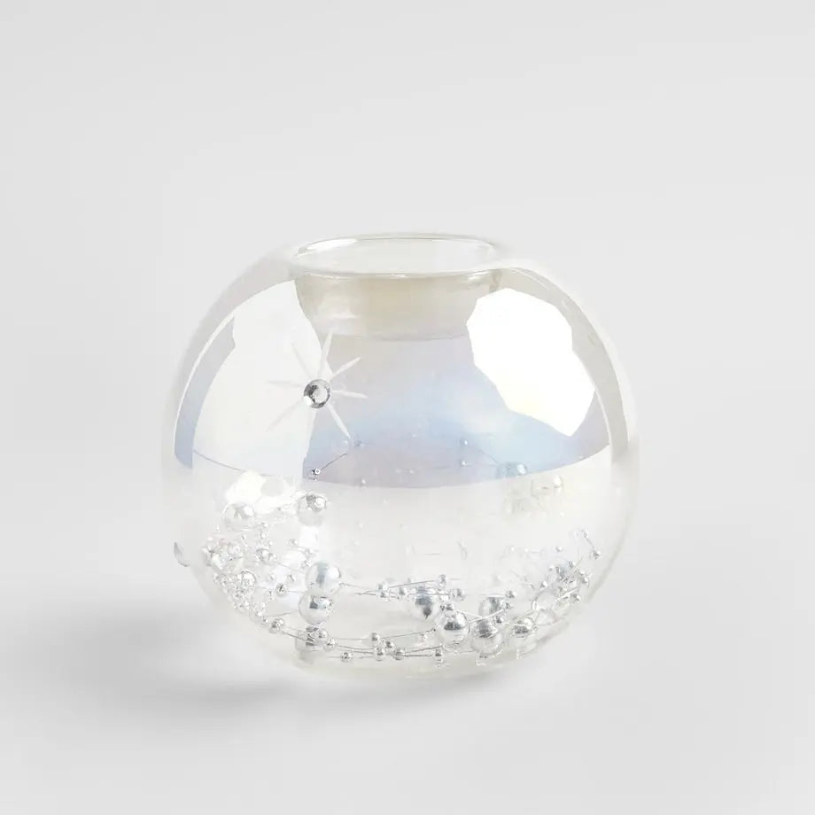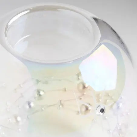 Táto elegantná, guľatá dekorácia je vyrobená z číreho skla, ktoré je ošetrené špeciálnou dúhovou (irizujúcou) povrchovou úpravou. Táto úprava dodáva sklu jemný perleťový lesk, meniaci odtiene od bielej po pastelové farby.
