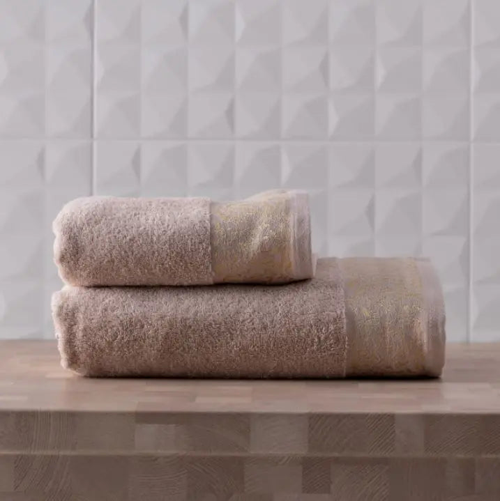 Béžový bavlnený uterák s elegantným vyšívaným okrajom. Má výbornú savosť a antibakteriálne vlastnosti. Jeho jemná štruktúra je bezpečná pre citlivú pokožku a antibakteriálne vlastnosti pomáhajú chrániť pokožku pred vývojom baktérií.