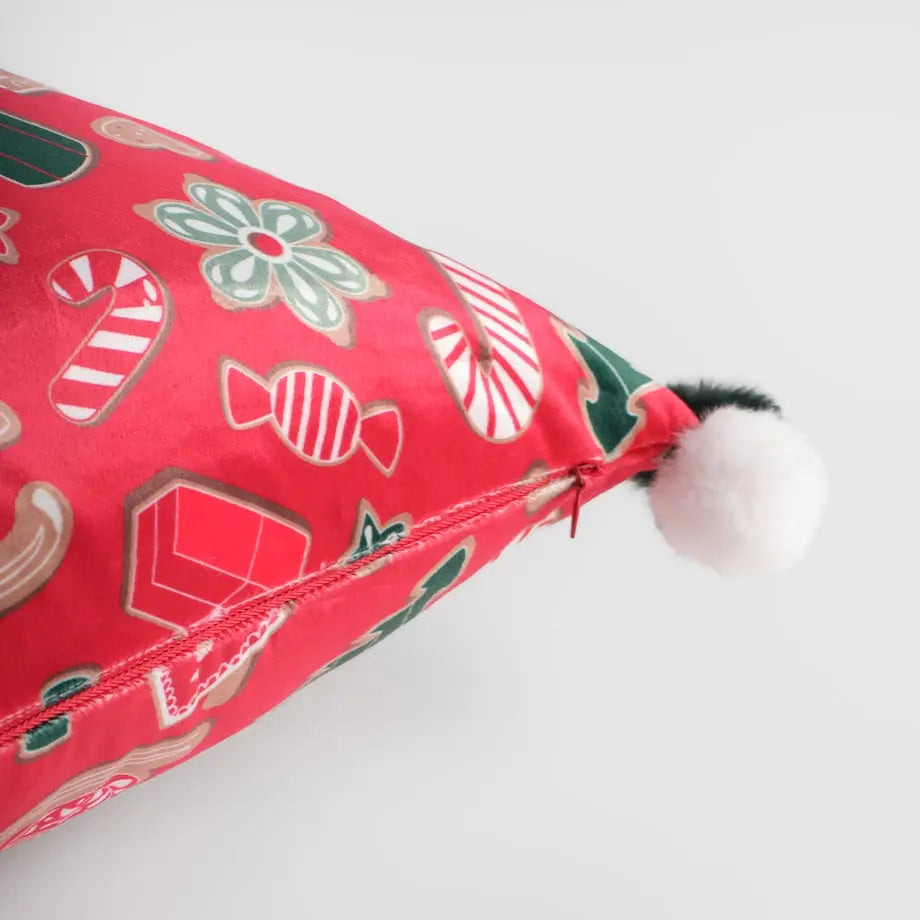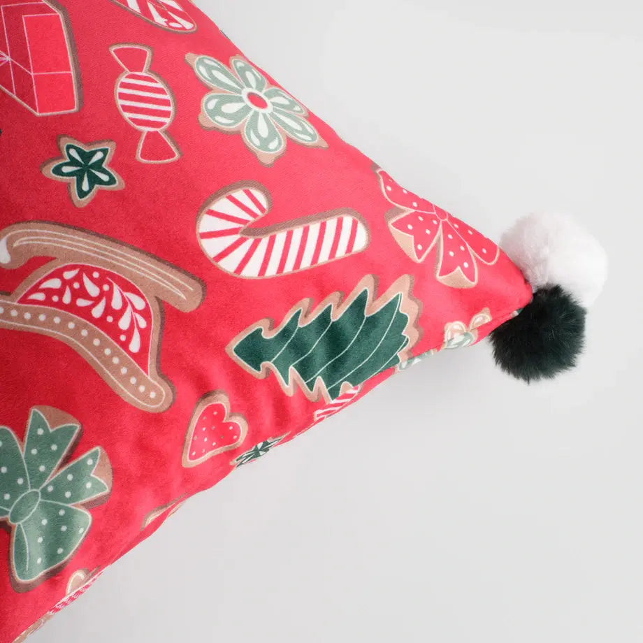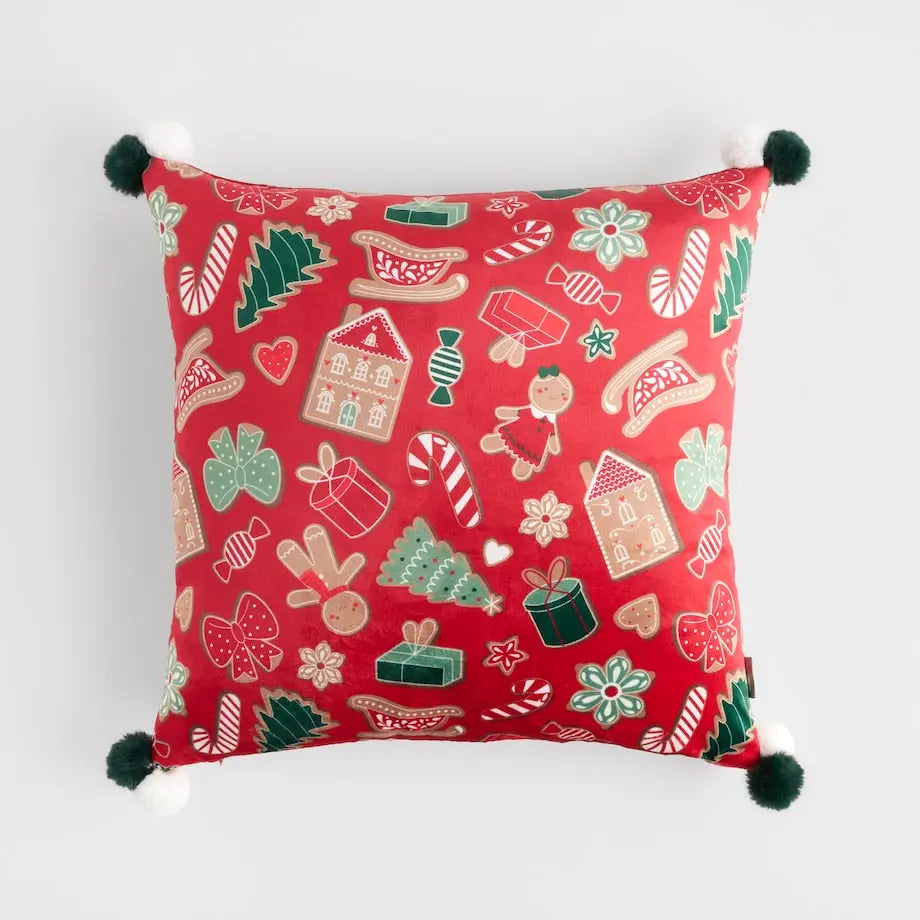 Žiarivo červená farba poskytuje perfektné pozadie pre potlačené sviatočné motívy – perníčky, cukríky, vianočné stromčeky a listy cezmíny v odtieňoch zelenej, bielej a béžovej. Drobné detaily, ako sú ozdobné brmbolce v rohoch a diskrétny zips, dotvárajú dizajn s dôrazom na estetiku. Obliečka na vankúš Ginno sa krásne hodí do klasického aj moderného interiéru. Je to perfektná voľba do obývačky, spálne alebo detskej izby a skvelý sviatočný darček.