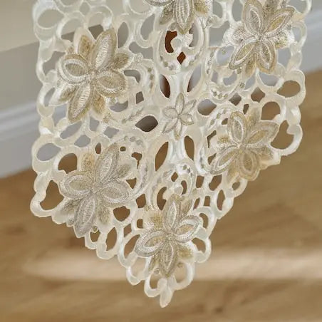 • Vzhľad: Behúň má jemný, priesvitný, sieťovaný základ, ktorý vytvára efekt "voľnej čipky" (cutwork).