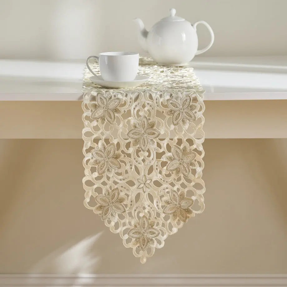 Ide o elegantný, dlhý behúň na stôl s prepracovanou čipkovou výšivkou a aplikáciami.