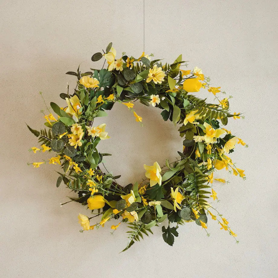 Privítajte jar tou najkrajšou farbou! Veniec z línie Fleuros so sýtymi žltými kvetmi je neprehliadnuteľným doplnkom, ktorý okamžite rozjasní akýkoľvek priestor. Či už ho zavesíte na vchodové dvere, nad krb, alebo ho použijete ako dominantu veľkonočnej tabule, tento veniec vnesie do vášho interiéru hrejivú atmosféru a pravú sviatočnú radosť.