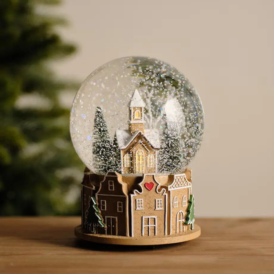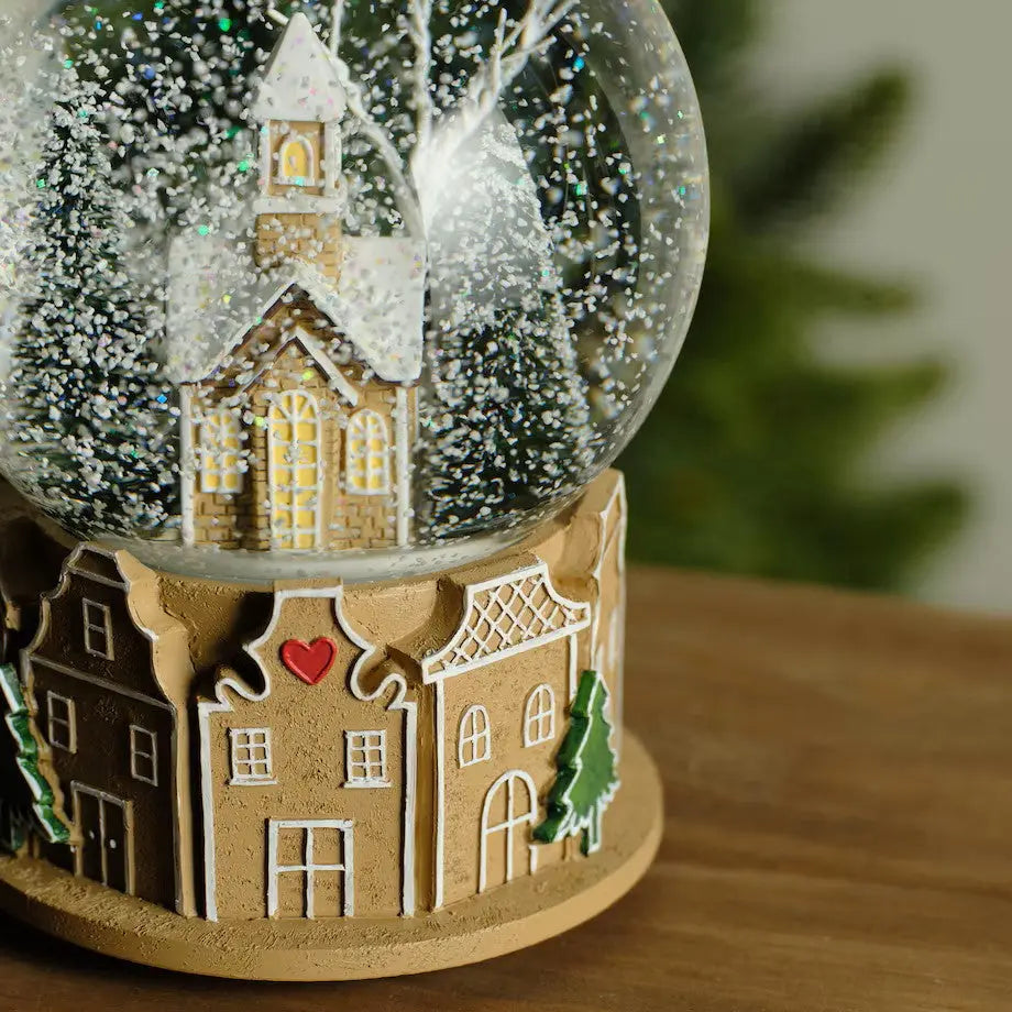 Dekoratívna snehová guľa, ktorá vytvára čarovný svet s domčekom na Vianoce.