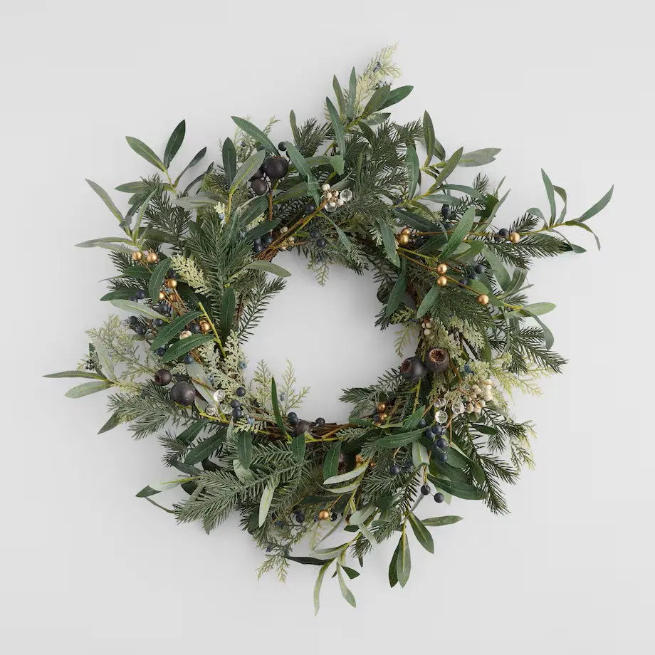 Tlmené zelené, jemné zlaté a strieborné gule, tmavofialové bobule a jemné hnedé šišky vytvárajú kompozíciu, ktorá zapadá do glamour štýlu s kvetinovým motívom. Husté usporiadanie prvkov dodáva celému objektu jedinečnú hĺbku, vďaka čomu je nadčasovou dekoráciou na zimné a sviatočné mesiace. Vyzerá dokonale na dverách, na stene aj na vianočnom stole. Dokonalý darček, ktorý poteší každého milovníka štýlových domácich doplnkov.