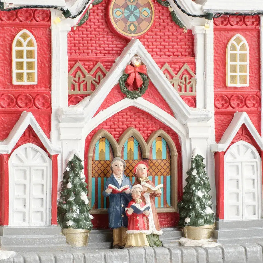 Výzdoba v podobe miniatúrneho kostola očaruje bohatstvom vianočných detailov – od červenej fasády s bielymi akcentmi, cez osvetlené okná až po zelené vence. Výzdobu dopĺňajú postavy koledníkov a miniatúrne vianočné stromčeky, vďaka ktorým figúrka prináša do interiéru kúzlo zimných sviatkov. Univerzálne farby a dizajn robia z festivalového domu ideálny priestor pre klasické, škandinávske aj rodinné aranžmány. Je to tiež originálny nápad na vianočný darček.