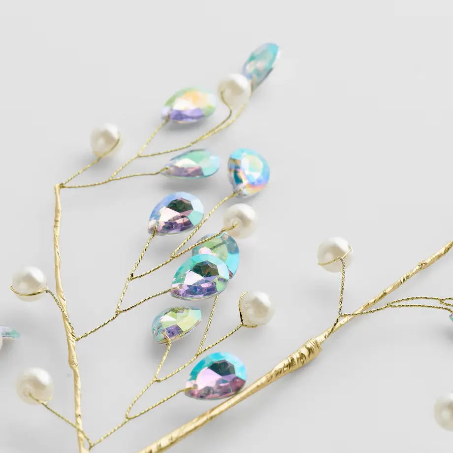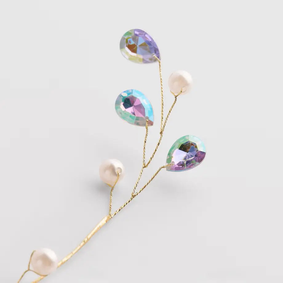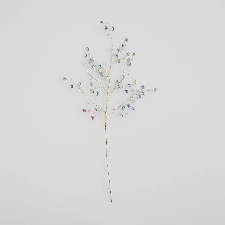 Jemná vetvička zdobená dúhovými kryštálmi v jemných odtieňoch fialovej, zelenej a modrej sa krásne mieša s bielymi, trblietavými perlami a vytvára efektívnu a elegantnú dekoráciu. Salónna kytica ladí s glamour, modernými alebo klasickými aranžmánmi. Je to univerzálny prvok pre vázu, stredovú dekoráciu, vianočný veniec alebo kvetinovú kompozíciu – bude dobre fungovať v obývačke, v kancelárii alebo počas osláv.