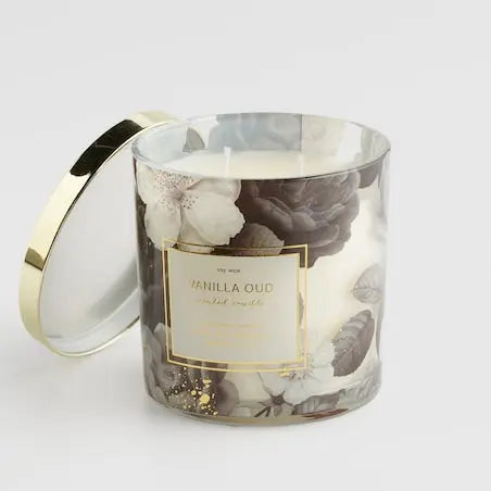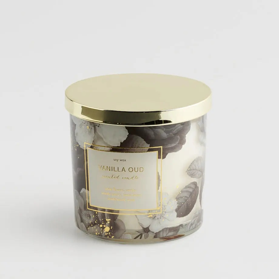 Povrchová úprava nádoby: So zlatou potlačou – na pohári je zlatý potlač s názvom sviečky (VANILLA OUD) a popisom tónov vône. Pohár je tiež zdobený zlatými trblietavými bodkami.