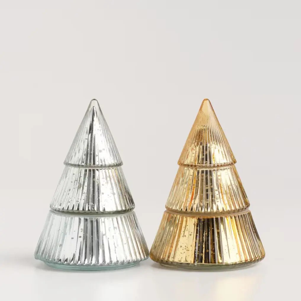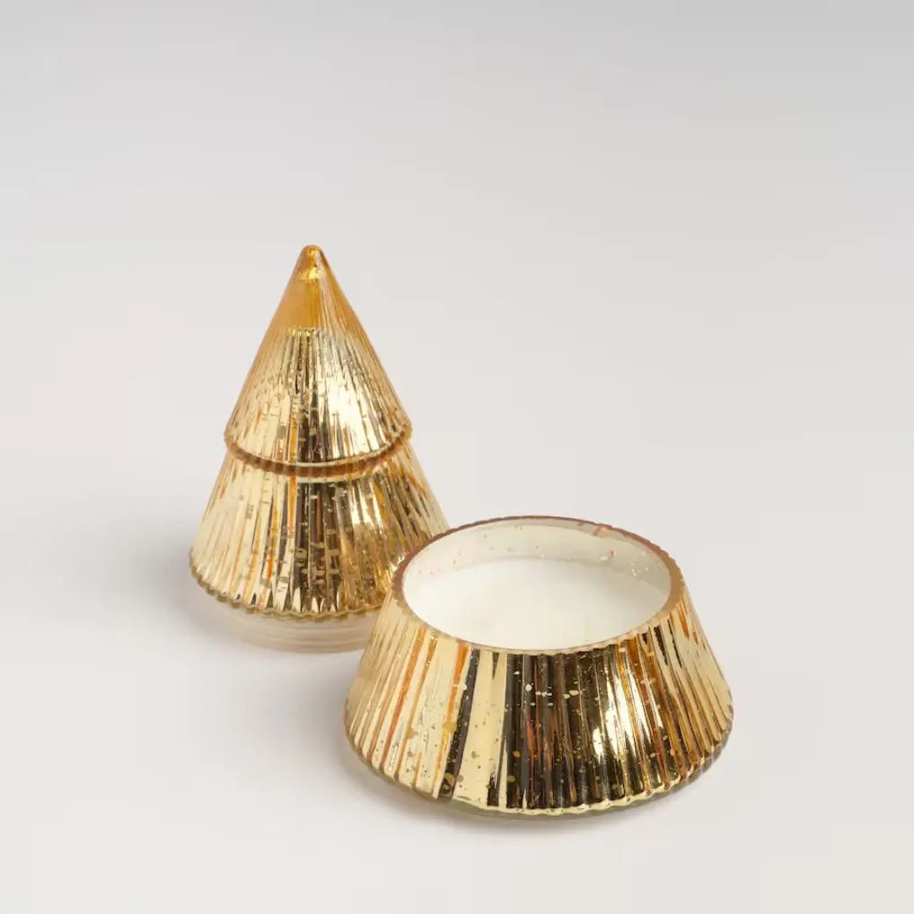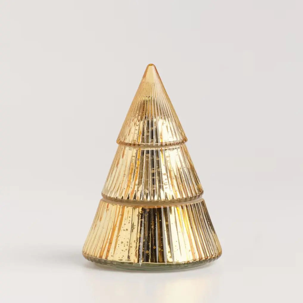 Zlatá vianočná vonná sviečka v podobe stromčeka.