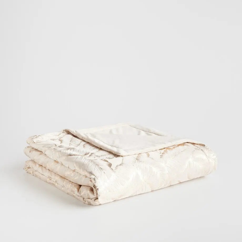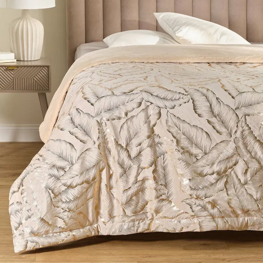 Die FOGLARE- Decke (220 x 240 cm) ist eine luxuriöse und wärmende Ergänzung für Ihr Schlafzimmer und ideal für ein Doppelbett . Ihr Hauptmerkmal ist ein reichhaltiges Muster mit Blattmotiv , das Ruhe und Harmonie der Natur in Ihr Zuhause bringt. Dank ihrer Größe und Verarbeitung bietet sie maximalen Komfort und eine stilvolle Optik .