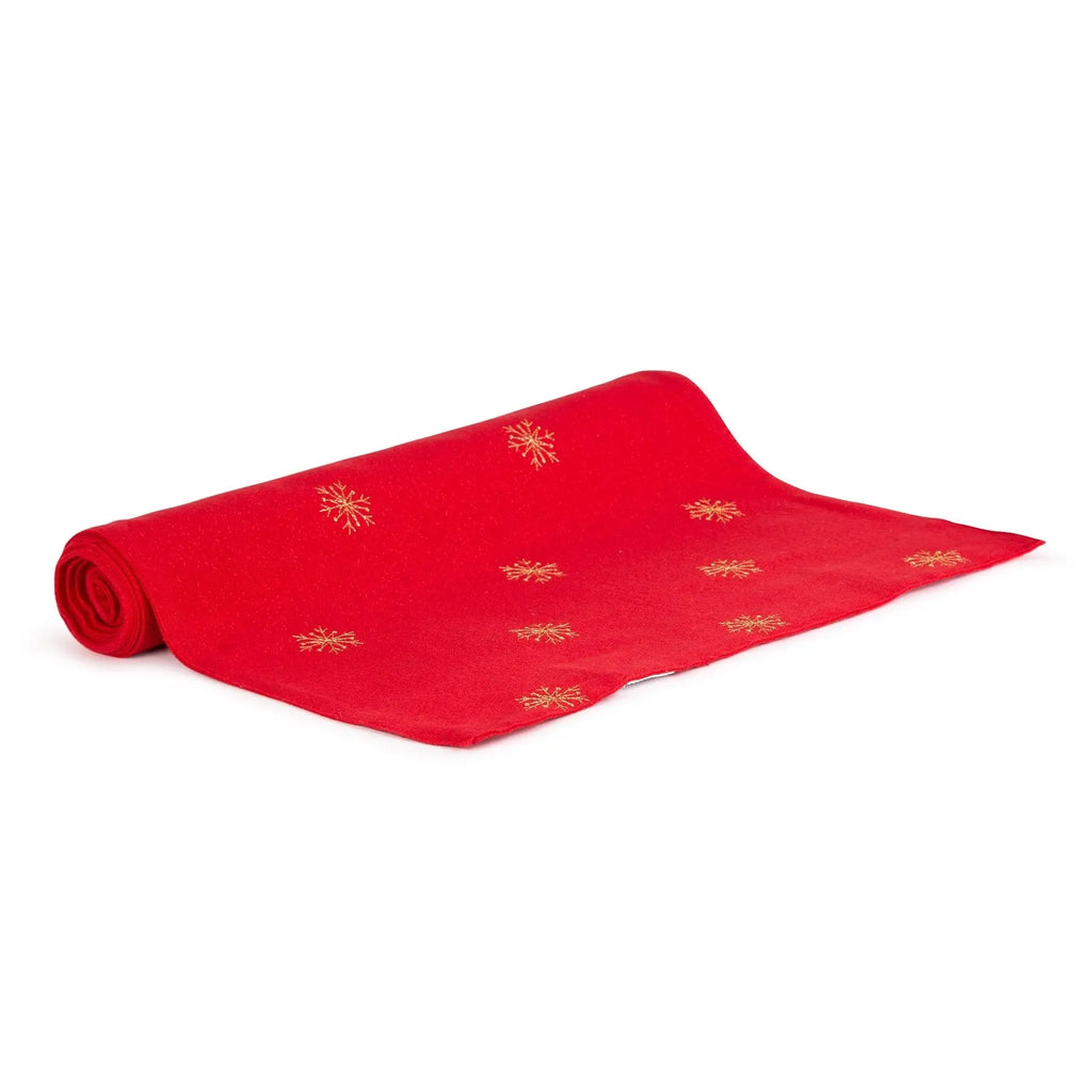 Die rote Oberfläche des Tischläufers wird durch zarte, gestickte Schneeflocken ergänzt. Dieses Wintermuster besticht vor allem durch seine Farbe – die Schneeflocken funkeln in einem eleganten Goldton. Diese Farbkombination verleiht dem Esszimmer garantiert eine festliche Atmosphäre. Der 40 x 160 cm große Tischläufer passt auf Standardtische und unterstreicht deren festlichen Charakter. Er harmoniert perfekt mit klassischem Weiß sowie Accessoires in Silber und Gold.