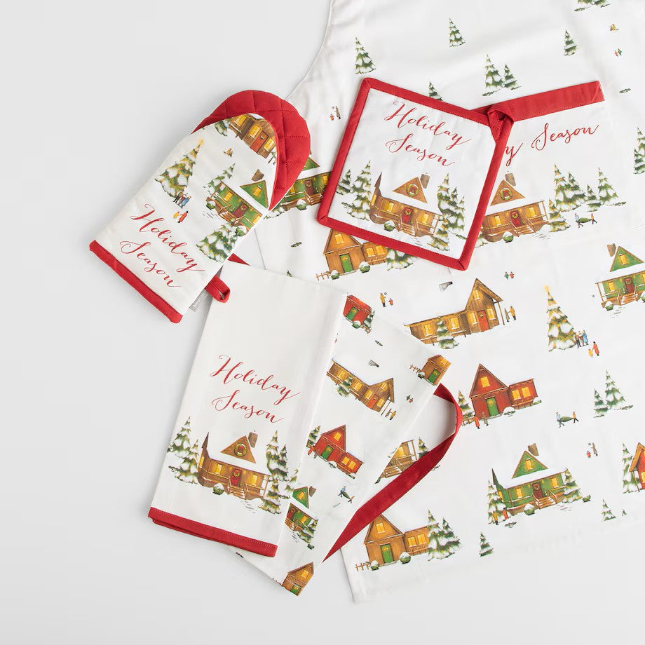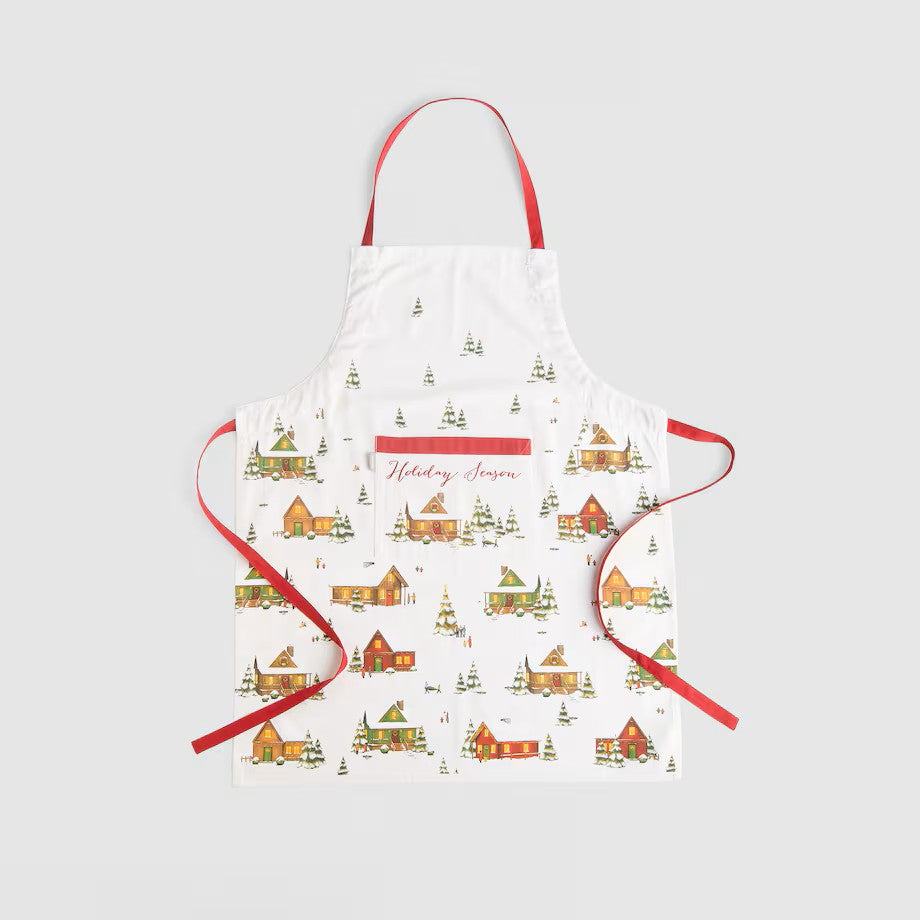Biela látka zdobená vianočnou potlačou domov a vianočných stromčekov prináša do kuchyne jedinečnú atmosféru. Červené detaily a vrecko s nápisom "Holiday Season" robia z Winhurst zástery ideálnu voľbu pre klasické, škandinávske aj moderné interiéry. Môže to byť tiež originálny darček pre milovanú osobu alebo praktický doplnok k kuchynskej textilnej súprave.