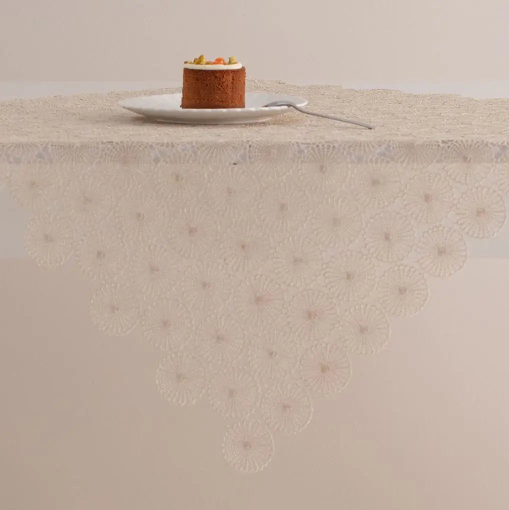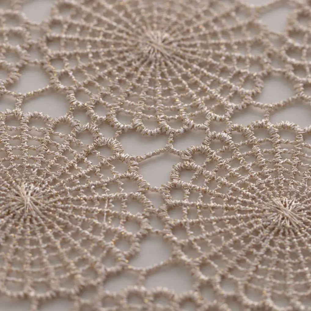 Goldfarbene Polyester-Tischdecke. Es ist ein wahres Meisterwerk der Handarbeit. Es verleiht dem Innenraum Eleganz und einen einzigartigen Stil. Es wird in der Häkeltechnik hergestellt und besticht durch komplexe Muster und präzise Verarbeitung. Die goldene Farbe verleiht Glanz und Luxus und macht es zu einem idealen Dekorationselement für besondere Anlässe sowie den täglichen Gebrauch. Durch das Häkeldesign entstehen wunderschöne durchbrochene Muster, die das Licht sanft durchlassen. Es passt perfekt zu verschiedenen Einrichtungsstilen, von klassisch bis modern, und verleiht ihm einen raffinierten Charakter.