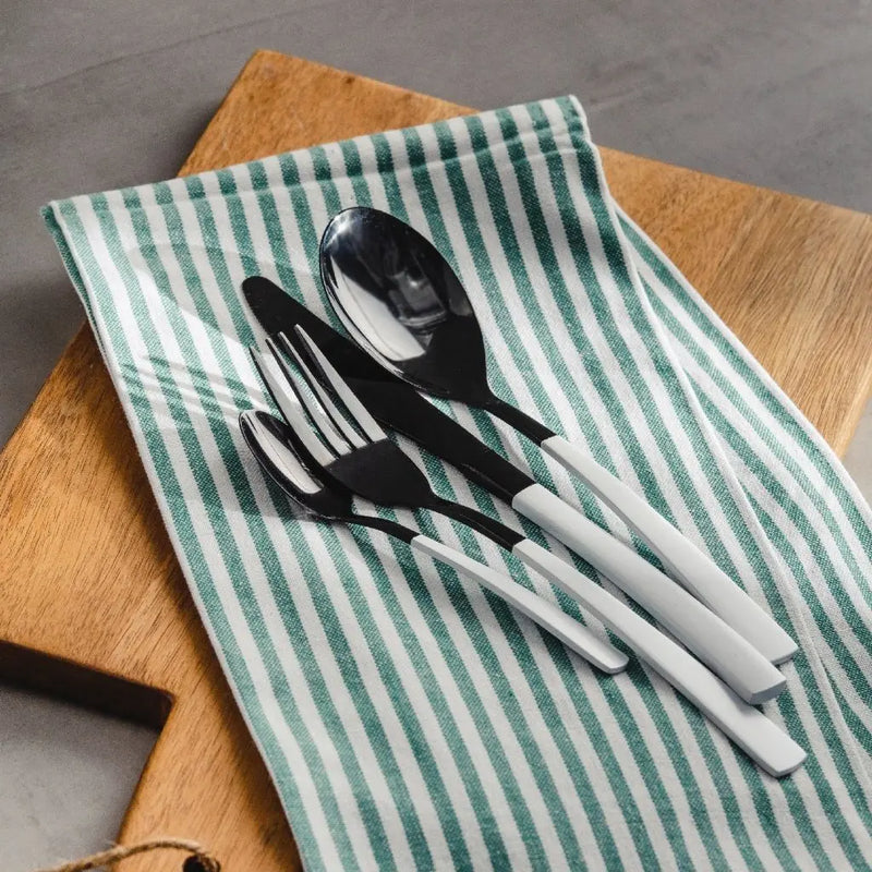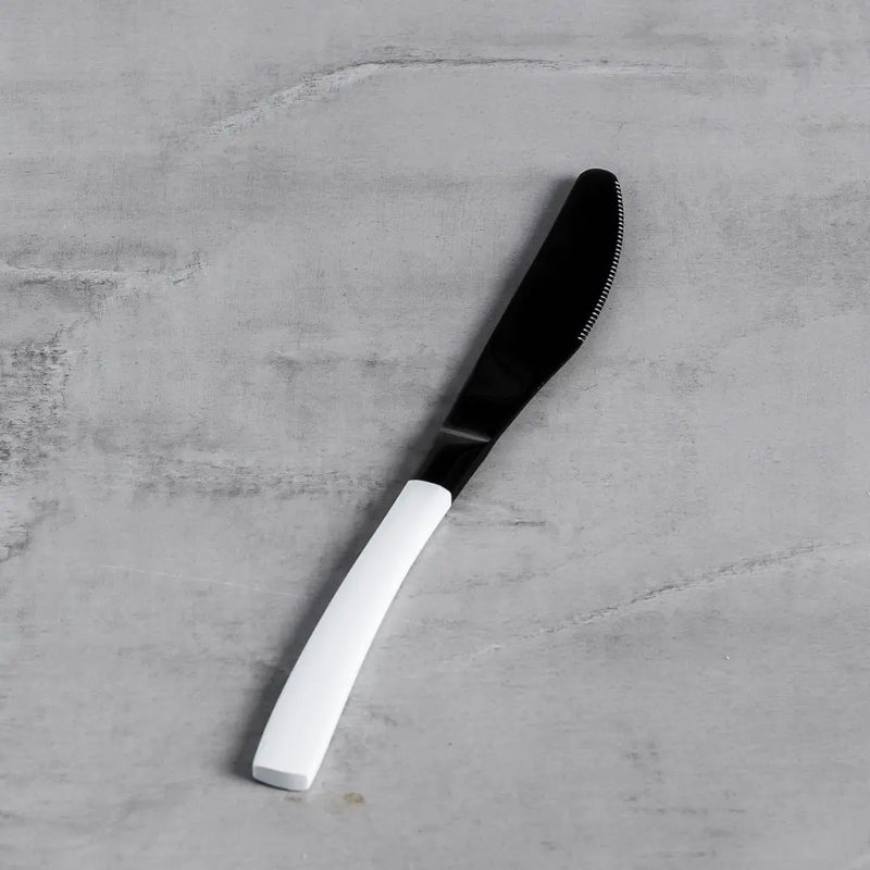 Schwarz-weißes Edelstahlmesser. Es hat ein klassisches Design. Sowohl für den Haushalt als auch für die professionelle Gastronomie geeignet.