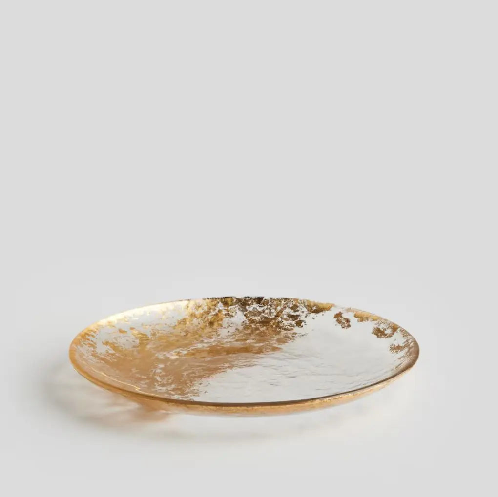 Dessertteller aus goldenem Glas. Ideal zum Servieren von Kuchen, Obst oder Pralinen. Sein elegantes Erscheinungsbild verleiht jedem Tisch einen Hauch von Luxus und lässt selbst die einfachsten Desserts köstlich aussehen. Ideal für besondere Anlässe und alltägliche Freuden.