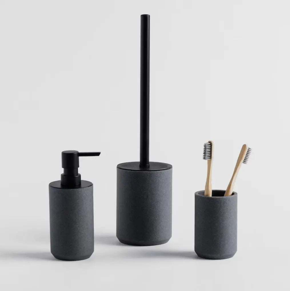 Ein grauer K -Körbchen. Die perfekte Ergänzung für die Inneneinrichtung Ihres Badezimmers. Es sorgt für Komfort und Hygiene bei täglichen Aktivitäten im Badezimmer. Ideal zur Aufbewahrung von Zahnbürsten und Zahnpasta.