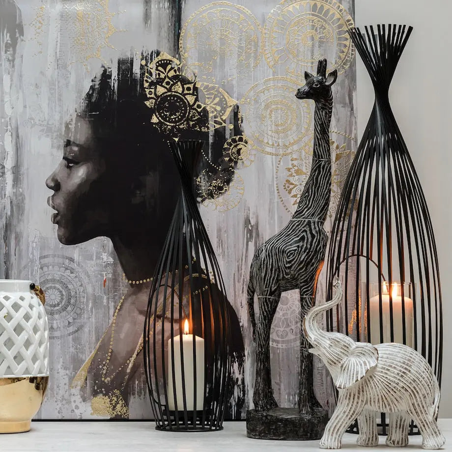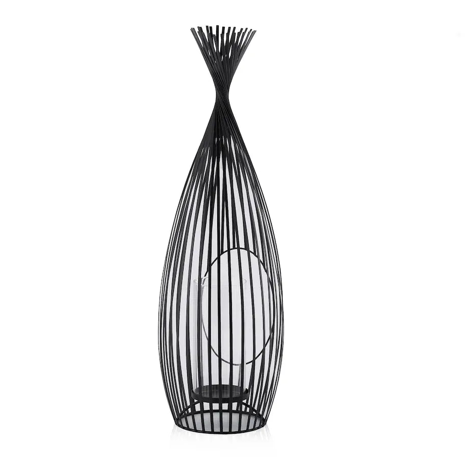 Wenn Sie auf der Suche nach einzigartiger Dekoration für Ihr Wohnzimmer sind, sollten Sie die schwarze Bundlis-Laterne in Betracht ziehen. Sie besteht aus kleinen, vertikal angeordneten Metalllamellen. Diese Lamellen sind von unten nach oben geformt und winden sich oben zu einem fantasievollen Bogen. Im Inneren befindet sich ein Glasrohr, in das durch eine ovale Öffnung eine Kerze eingesetzt wird. Die Bundlis-Laterne hat die Größe XL und erreicht eine Höhe von 70 cm. Sie kann auf dem Boden oder auf einem höheren Möbelstück stehen. Wenn sie leuchtet, verbreitet sie eine wunderbare Atmosphäre im Raum.