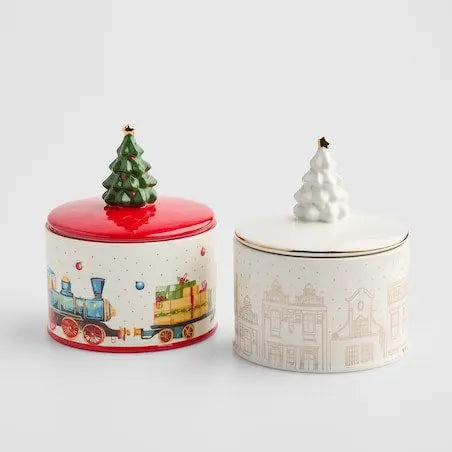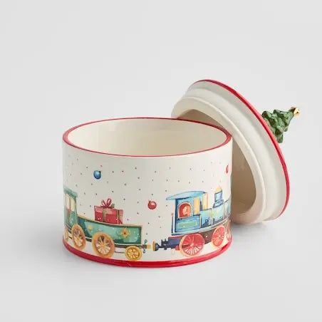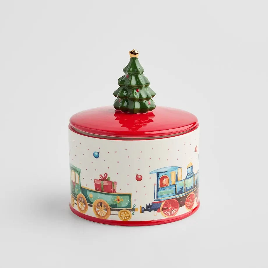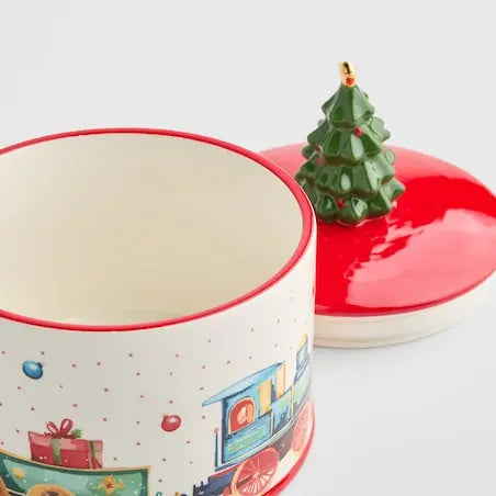 Das Gefäß besteht aus Dolomit , was ihm eine angenehme, feste Struktur und eine glatte, glänzende Oberfläche verleiht. Das dominierende Motiv sind fröhliche Weihnachtszüge in leuchtendem Grün und Blau, die den Gefäßkörper umkreisen. Einer der Waggons transportiert ein Geschenk , was die festliche Atmosphäre verstärkt. Der weiße Hintergrund ist zart mit roten Punkten und kleinen Weihnachtskugeln bestreut.