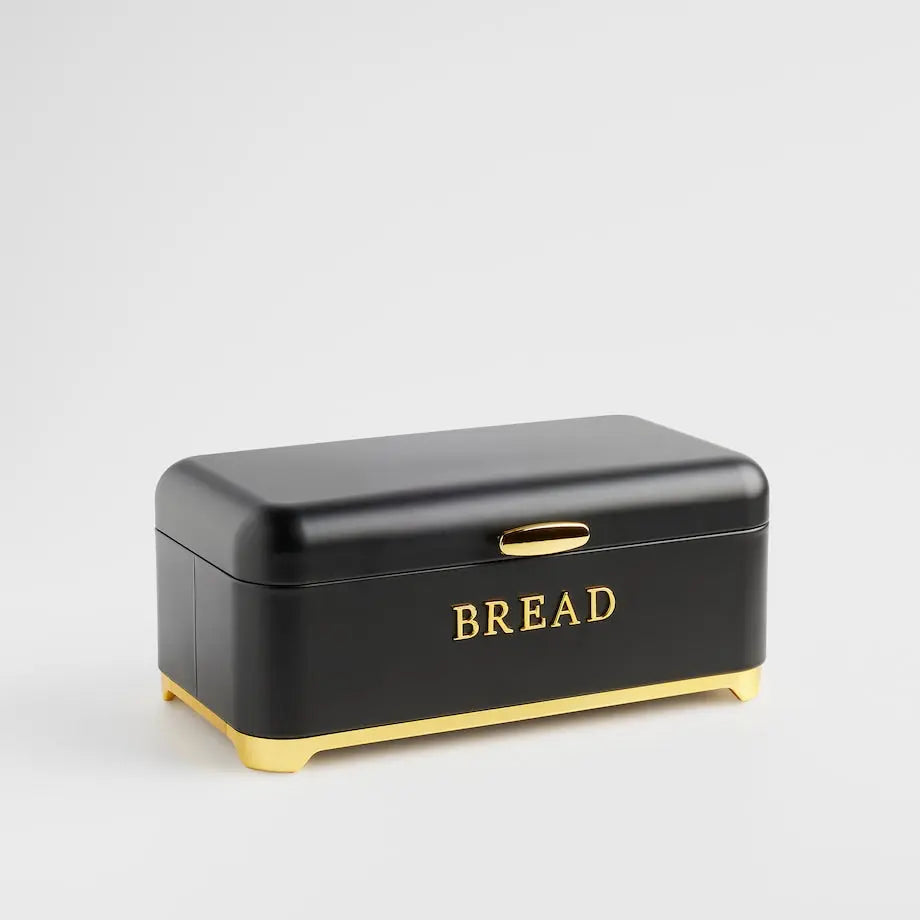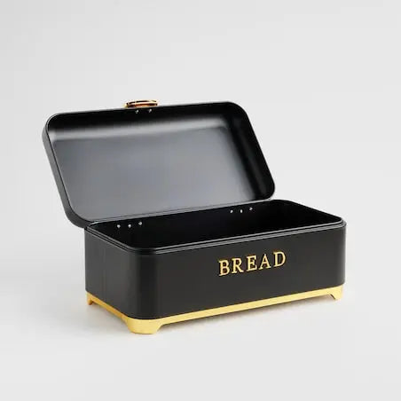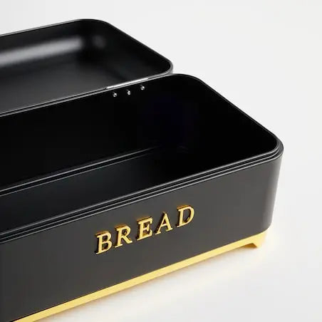Der elegante schwarze Panne-Brotkasten mit goldenen Akzenten ist der Inbegriff modernen Designs. Die Kombination aus mattem Schwarz und schimmerndem Gold verleiht ihm einen einzigartigen Charakter und passt sowohl in moderne als auch in klassische Einrichtungen. Die schlichte Form und der minimalistische Stil des Panne-Brotkastens fügen sich perfekt in jede Einrichtung ein. Er ist auch ein tolles Geschenk für Liebhaber von Brot und schönen Küchenaccessoires.