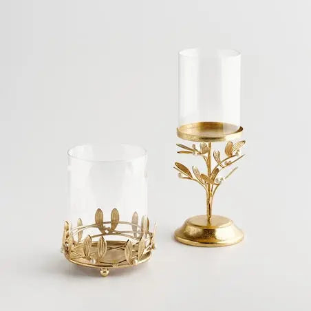 Dies ist ein niedriger Tischkerzenständer mit einem zylindrischen Glaszylinder, der für die Aufnahme einer Tee- oder kleinen Stumpenkerze konzipiert ist.