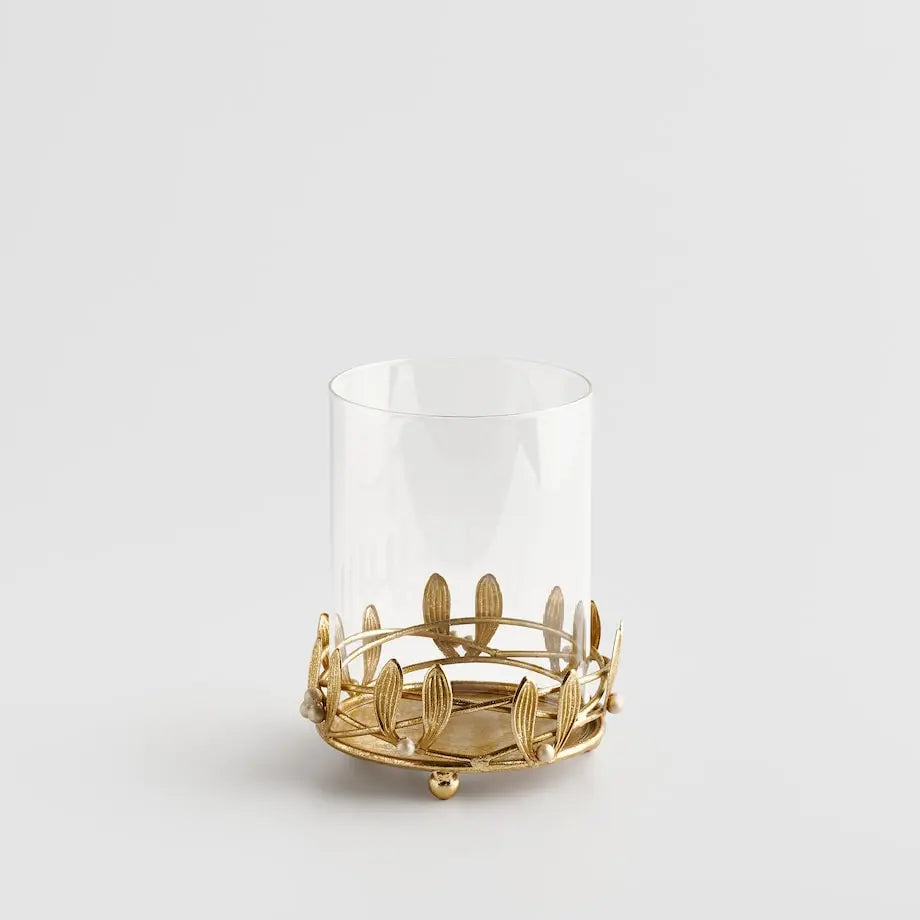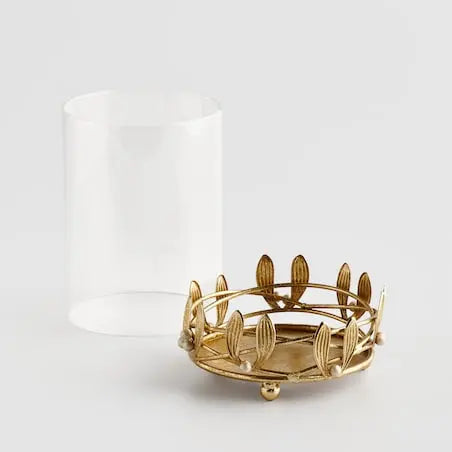 Um den Kerzenhalter herum befindet sich ein dekorativer Metallrahmen, der mit einem durchgehenden Blütenblatt- oder Kranzmotiv verziert ist.