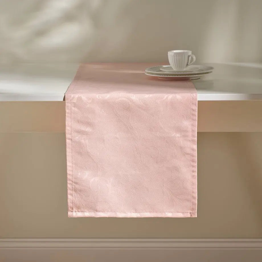 Eleganter rosafarbener Läufer aus Polyester. Sein dezentes Muster und der gedämpfte Farbton harmonieren perfekt mit klassischen und modernen Arrangements und verleihen dem Tisch ein elegantes und stilvolles Aussehen. Ideal, um jedem Raum Wärme und Eleganz zu verleihen.