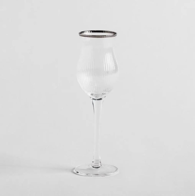 Transparentes Spirituosenglas mit silbernem Rand. Hergestellt aus hochwertigem Material. Ideal für festliche Mittagessen und ungezwungene Anlässe. Es wird wirklich schön auf dem Tisch aussehen. Es sorgt für ein angenehmes kulinarisches Erlebnis.