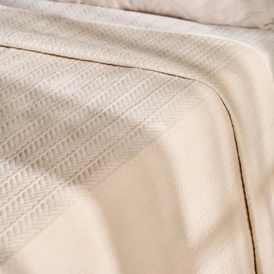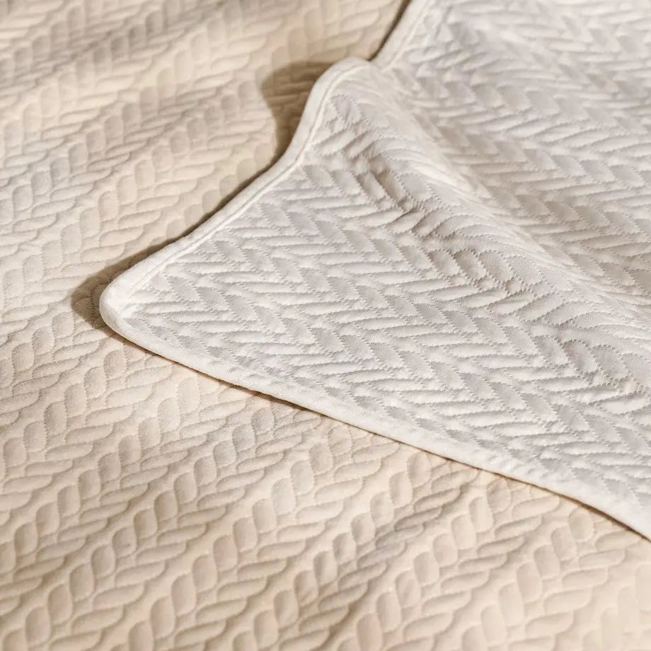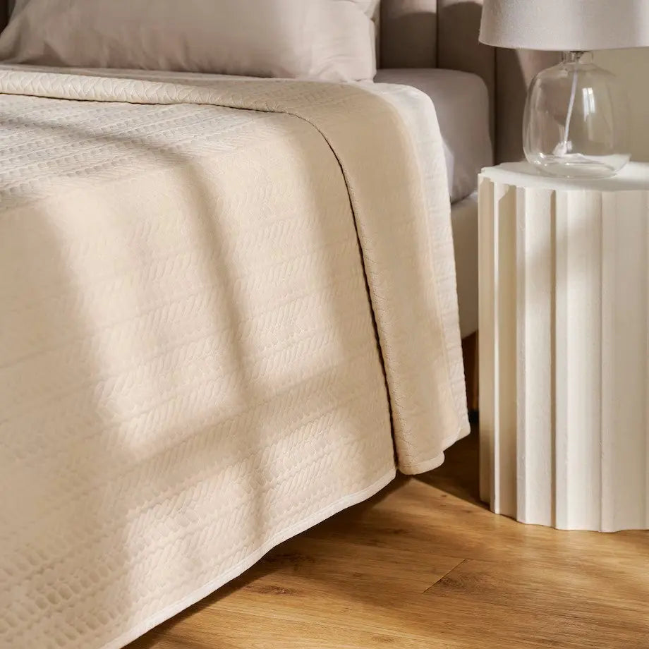Jaltis-Decke kombiniert warmer, heller Beigeton mit elegantes, geprägtes Muster – auf einer Seite Fischgrätmuster auf der anderen Seite, zart Seil . Universelles Design Es eignet sich gleichermaßen für klassische, moderne und minimalistische Layouts. Einzigartiger Saum und abgerundete Ecken betonen Sorgfältige Arbeit. Es ist die perfekte Ergänzung für jedes Interieur oder Stilvolles Geschenk .