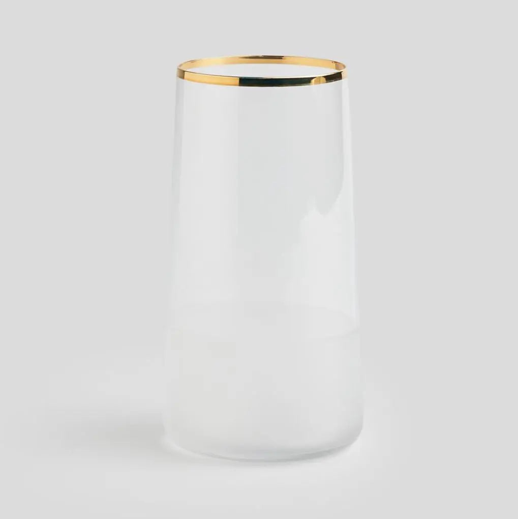 Ein elegantes transparentes Glas aus Kalknatronglas, verziert mit einem zarten Goldrand, ist eine perfekte Ergänzung für jede Küche. Er eignet sich ideal zum Servieren von Getränken und kombiniert Funktionalität mit einem luxuriösen Look. Es ist eine ideale Wahl für stilvolle Tischdekorationen für besondere Anlässe und alltägliche Momente.