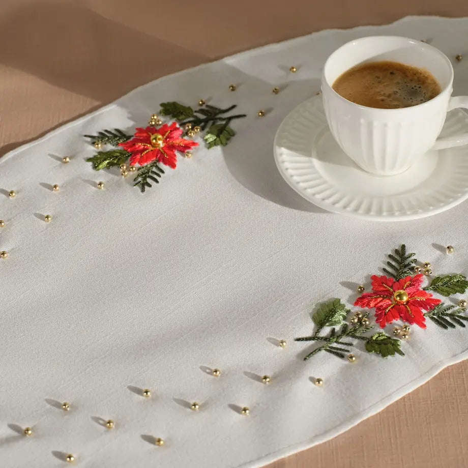 Der weiche, weiße Stoff mit gestickten roten Blüten und grünen Blättern verleiht der Serviette eine festliche Note. Die passenden goldenen Punkte und die präzise Verarbeitung machen die Merri-Serviette zu einer einzigartigen Bereicherung für Ihr Esszimmer. Dieses Produkt passt perfekt zu traditionellen, klassischen und modernen Einrichtungen und ist somit die ideale Wahl für Familienfeste oder als elegantes Geschenk.