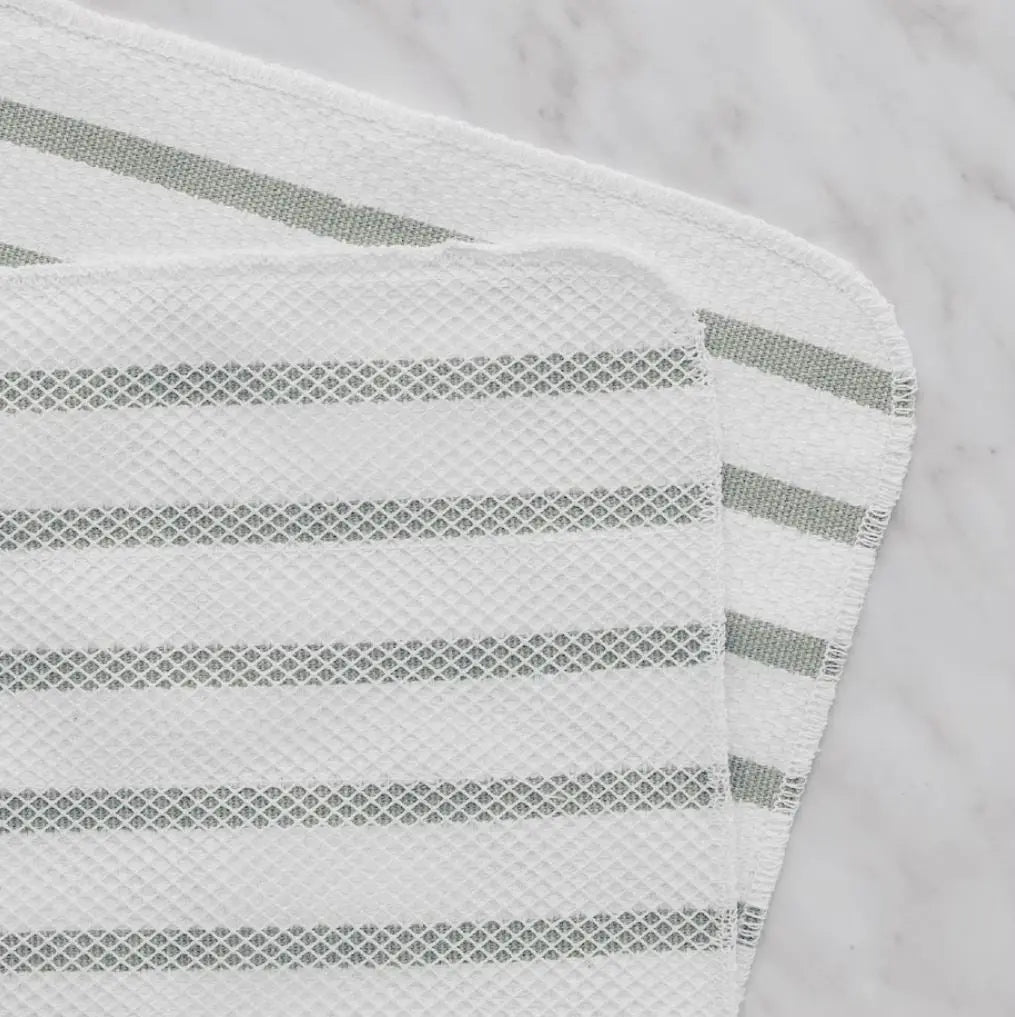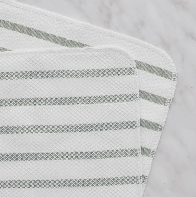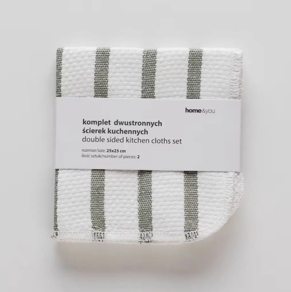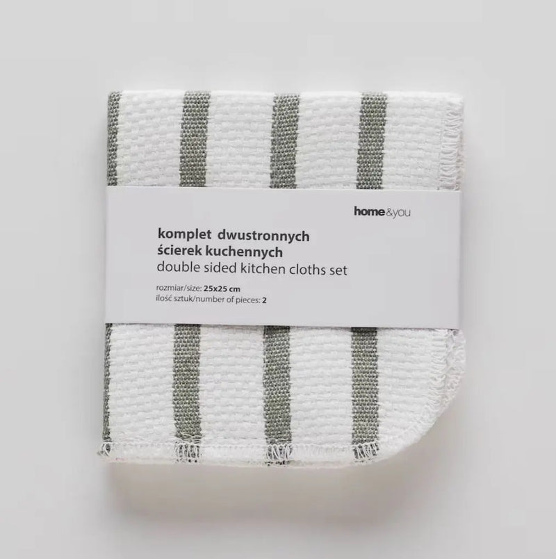 Set aus zwei quadratischen Küchentüchern in elegantem Weiß mit grünen Streifen. Sie sind nicht nur praktische Werkzeuge für die tägliche Küchenarbeit, sondern auch ein stilvolles Accessoire, das Ihrer Küche Charakter und Eleganz verleiht. Diese vielseitigen Handtücher bestehen auf der einen Seite aus hochwertiger Baumwolle und auf der anderen Seite aus Polyester und vereinen die besten Eigenschaften beider Materialien. Baumwolle ist weich und saugfähig, sodass Feuchtigkeit und Schmutz leicht entfernt werden, während Polyester für Strapazierfähigkeit und Pillingbeständigkeit sorgt. Die schwarzen Streifen verleihen ihnen ein elegantes und modernes Aussehen, das perfekt zu vielen Küchenstilen passt. Die praktische Quadratform ermöglicht eine bequeme Handhabung und präzises Wischen von Oberflächen und die solide Verarbeitung garantiert eine lange Haltbarkeit.