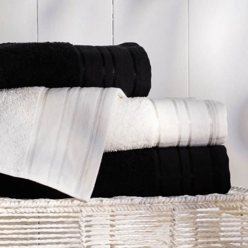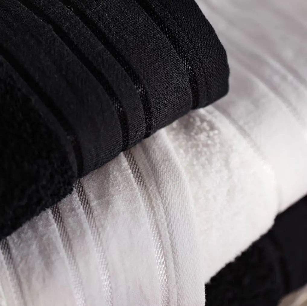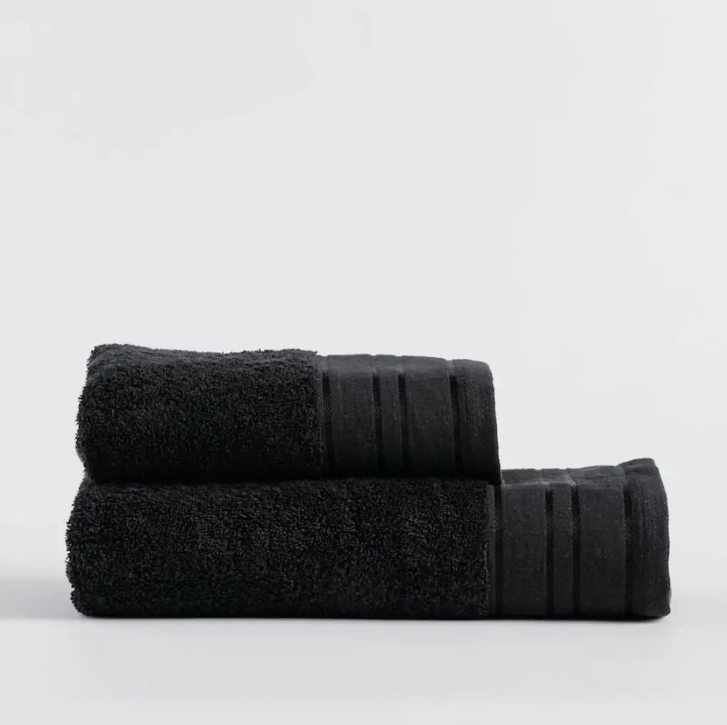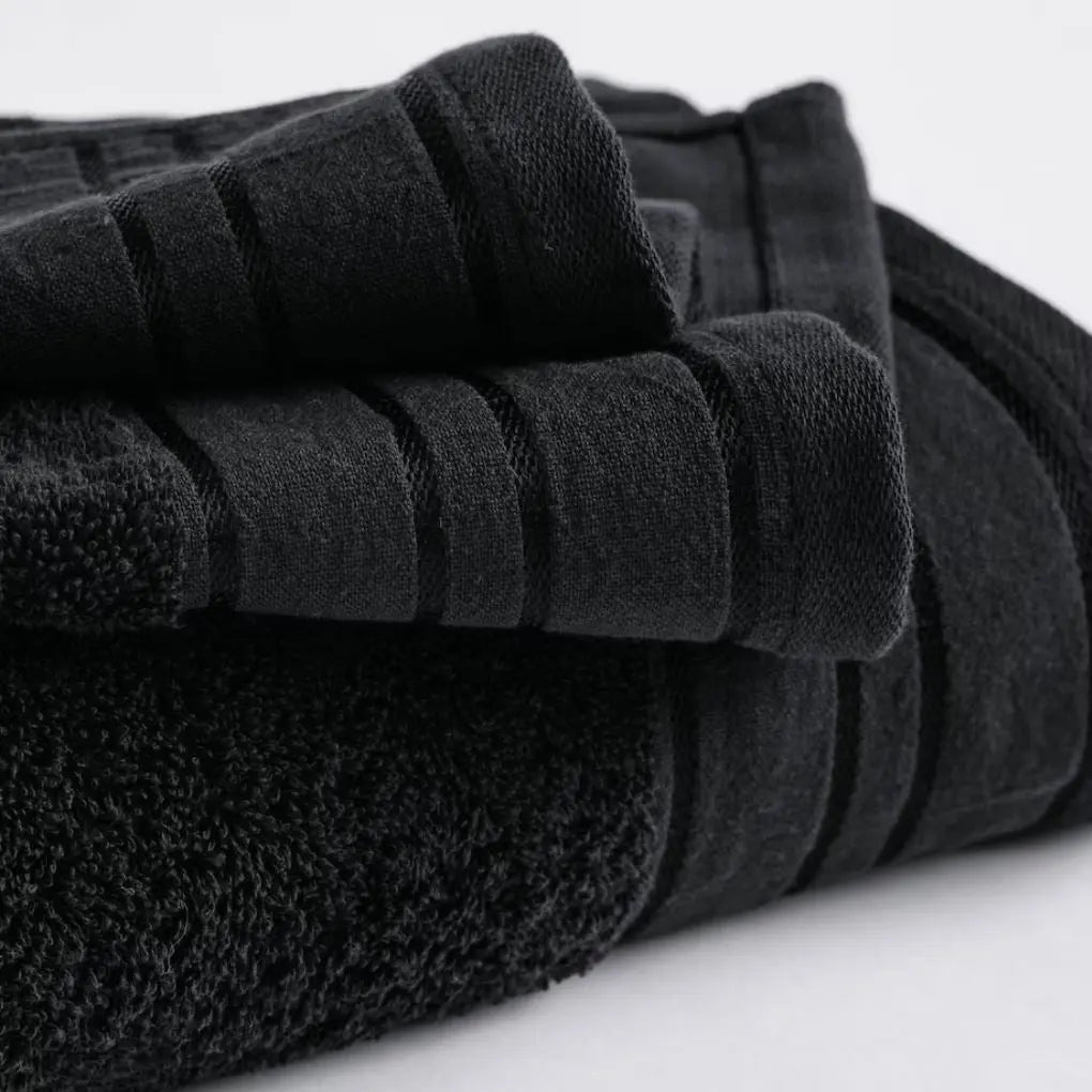 Schwarzes Handtuch. Das Produkt besteht aus Baumwolle. Es verfügt über eine hervorragende Saugfähigkeit und antibakterielle Eigenschaften. Seine feine Struktur ist sicher für empfindliche Haut und seine antibakteriellen Eigenschaften tragen dazu bei, die Haut vor der Entwicklung von Bakterien zu schützen.