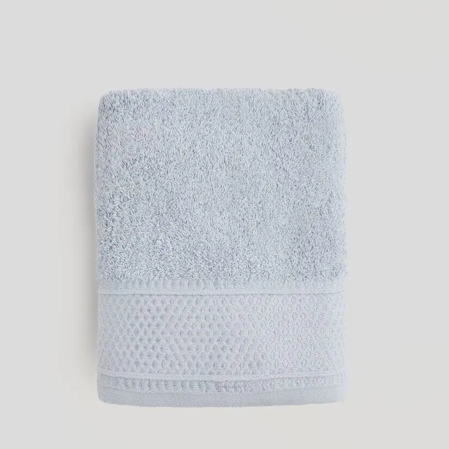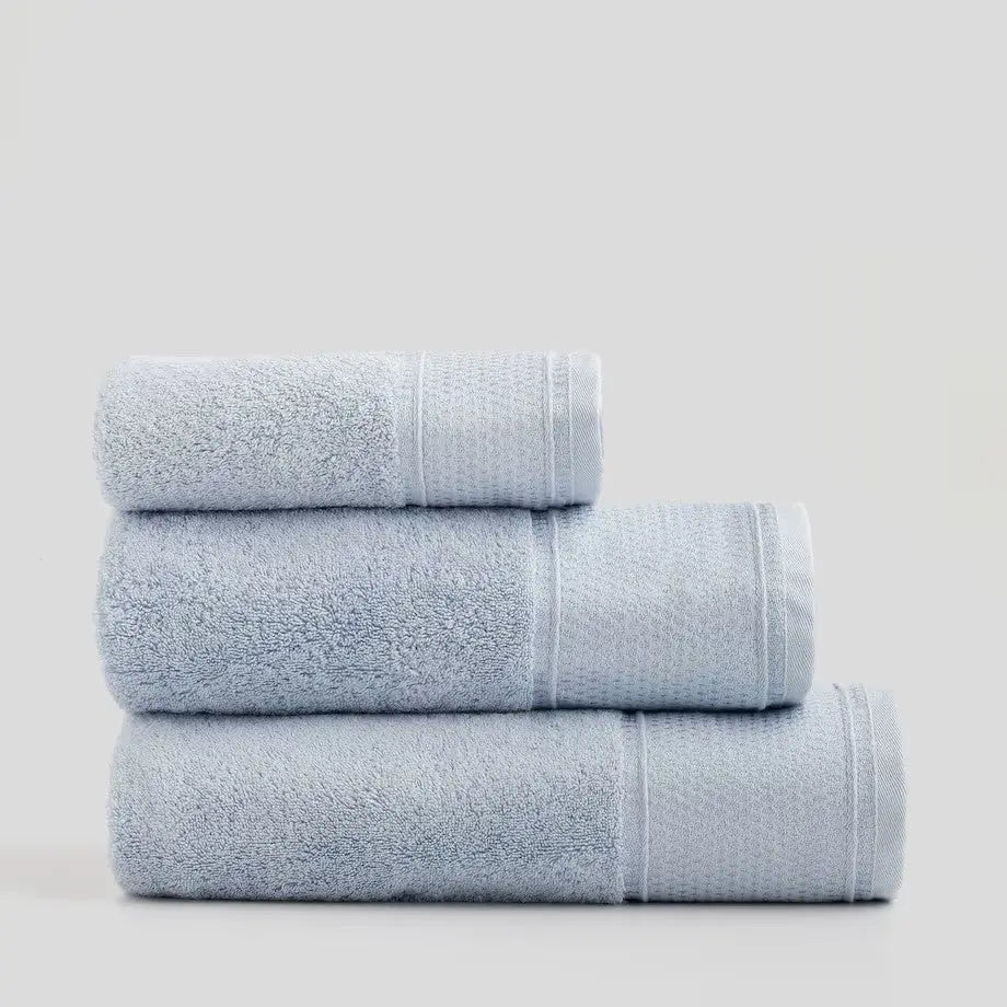Das Destello Handtuch besteht aus zertifizierter ägyptischer Baumwolle, die für ihre Weichheit, Dichte und Haltbarkeit bekannt ist. Der weiche Frotteestoff absorbiert Feuchtigkeit reichlich und sorgt für ein angenehmes Tragegefühl, auch bei empfindlicher Haut. Es behält seine Eigenschaften lange, ohne seine Form oder Farbe zu verlieren. Der hellblaue Farbton des Handtuchs ist vom ruhigen Himmel und der kristallklaren Reflexion des Wassers inspiriert – er bringt ins Badezimmer wohltuende Frische. Ein markanter Zierstreifen mit dichter geometrischer Webart setzt einen markanten optischen Akzent, der traditionelle Handwerkskunst mit moderner Ästhetik verbindet. Dank seines schlichten, klassischen Schnitts und der präzisen Kantenverarbeitung erfüllt er die Erwartungen der anspruchsvollsten Liebhaber von Alltagskomfort. Das Ganze wurde mit dem ästhetische Harmonie, die Sie sowohl in klassischen als auch in modernen Arrangements zu schätzen wissen.