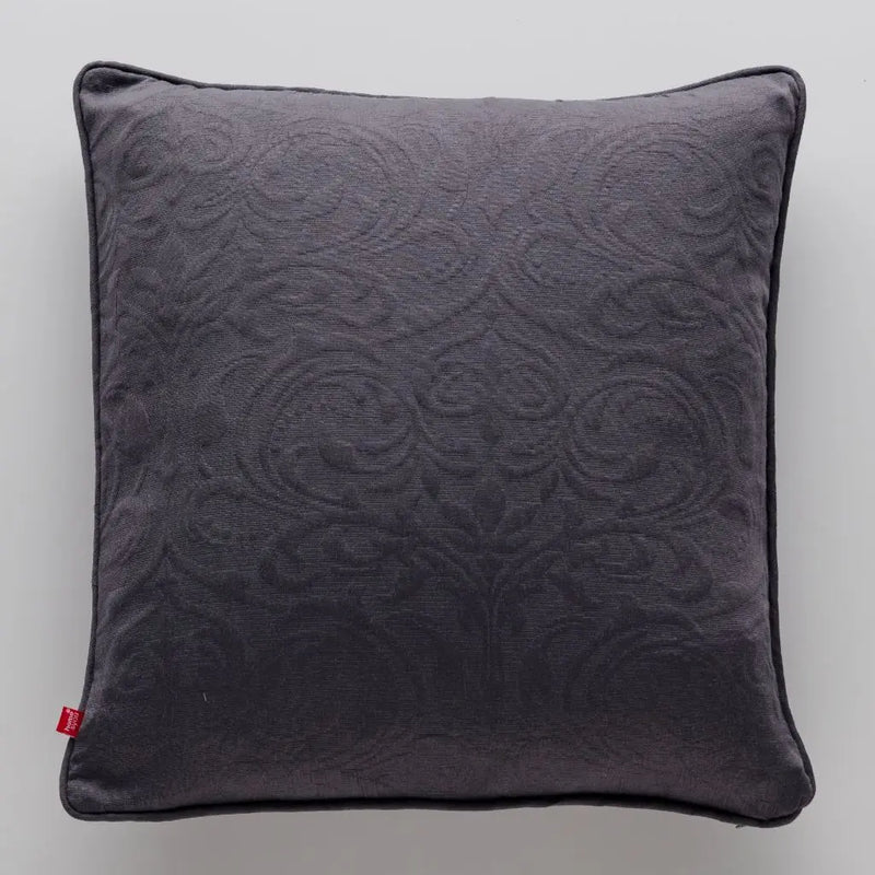 Grauer Kissenbezug mit zartem Ornament. Es verleiht Ihrem Zuhause einen sanften Charme. Es verleiht jedem Raum Gemütlichkeit, Komfort und Stil. Es hat eine angenehme, weiche Stoffstruktur.