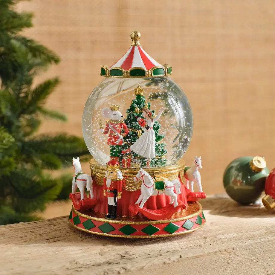 Im Inneren der Kugel befindet sich eine detailreiche Winterlandschaft aus dem Nussknacker-Märchen, die gleichzeitig kalt und romantisch wirkt.