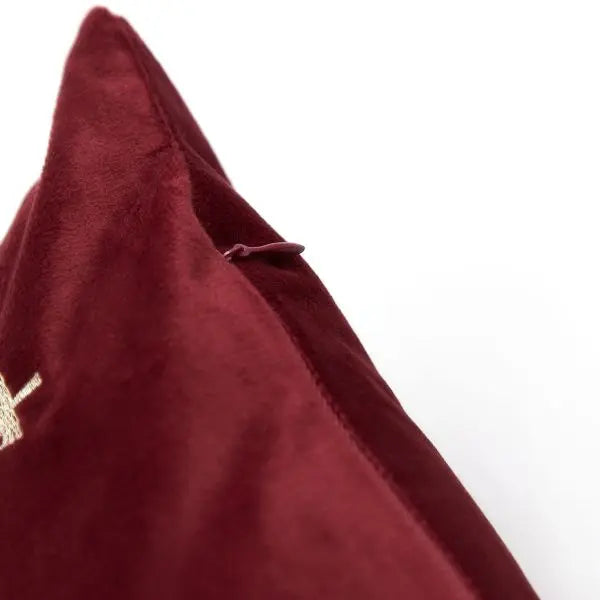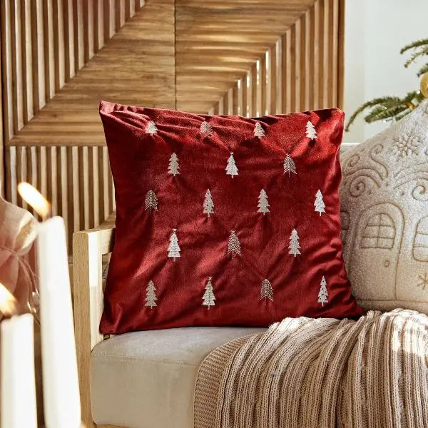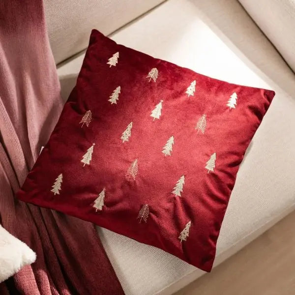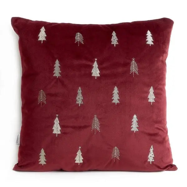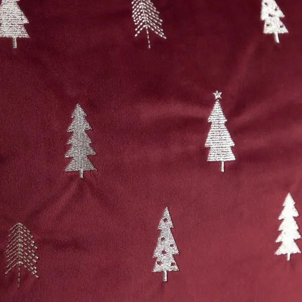 Der ARBA-Kissenbezug ist aus bordeauxrotem Stoff gefertigt und harmoniert hervorragend mit hellen Farben, Weiß und klassischem Schwarz. Er ist mit schlichten, goldgestickten Weihnachtsbäumen verziert.