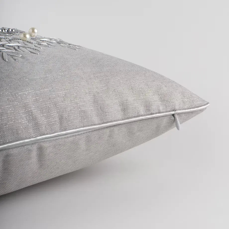 Das Produkt umfasst einen dekorativen Kissenbezug ( 45 x 45 cm) mit verdecktem Reißverschluss für einfaches Beziehen. Der Kissenbezug ist präzise gesteppt und mit feinen Perlen verziert und besticht durch seine Detailgenauigkeit und hochwertige Verarbeitung.